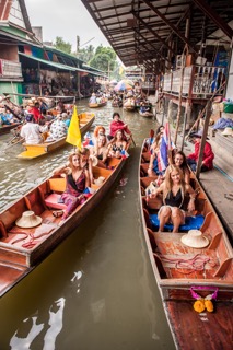 a rychlejší než autobusy nebo vlaky,“ vysvětluje Ali Marzouki z Thajské centrály pro cestovní ruch. Po krátkém přeletu z Phuketu do Bangkoku, který byl pro dívky zároveň poslední destinací, je už netrpělivě vyhlíželi odborníci na thajskou kuchyni v hotelu Aetas Lumpini. Odpoledne se doslova vyřádily v přípravě místních specialit. Ze spousty čerstvého ovoce, zeleniny, rýže, masa a darů moře připravily několik jednoduchých a tradičních jídel. Že si thajskou kuchyni neodpustí ani doma, se shodly všechny zúčastněné. V Bangkoku navštívily několik významných památek včetně Velkého paláce. Okouzleny byly i pohledem na Damnoen Saduak, neboli „Plovoucí trh“. „Sto kilometrů od Bangkoku se nachází poslední autentický thajský trh, kde se nakupuje přímo z lodičky. Dívky se nadále odebraly do Wat Pho, druhého nejvýznamnějšího chrámu v Bangkoku, kde je umístěna 46 metrů dlouhá socha ležícího Buddhy,“ sděluje Karel Uhlíř z cestovní kanceláře Čedok. Odpoledne si finalistky soutěže mohly vyrobit typický thajský deštník a naučit se základům tradičního thajského tance. Kromě návštěvy památek se dívky večer podívaly na známou divadelní show Siam Niramit.