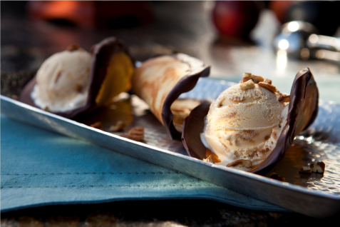 Ve středně velké míse smíchejte bílky s cukrem a metličkou vyšlehejte do nadýchaného sněhu (3 až 5 minut). Poté vmíchejte mouku, sůl, rozpuštěné máslo, smetanu a vanilku. Předehřejte si velkou teflonovou pánev. Dvě lžíce směsi rozetřete pomocí špachtle a vytvořte palačinku o průměru zhruba 11 cm. Smažte na okrajích dozlatova (2-3 minuty), otočte a na druhé straně smažte už jen 1 minutu. Vyjměte z pánve a okamžitě zavěste palačinku přes rukojeť dřevěné vařečky. Nechte palačinku vychladnout 5 minut – tím docílíte formy na tacos. Stejným způsobem zpracujte zbytek těsta. Pak ponořte studené tacos do rozpuštěné čokolády a opět zavěste na vařečku. Pokud tacos neservírujete ihned, uložte je do lednice. Tacos naplňte mírně rozteklou zmrzlinou a ozdobte nasekanými ořechy.