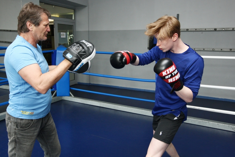 A pak už se „chlapci“, ten starší i mladší, pustili do boje. Bušili do sebe hlava nehlava, trenér občas prohodil nějakou poznámku a připomínku a jelo se dál. Krev, samozřejmě, netekla, ani nehrozilo žádné předčasné ukončení souboje, ale kapky potu na čele aktérů prozrazovaly, že ani jeden z borců trénink nešidí.