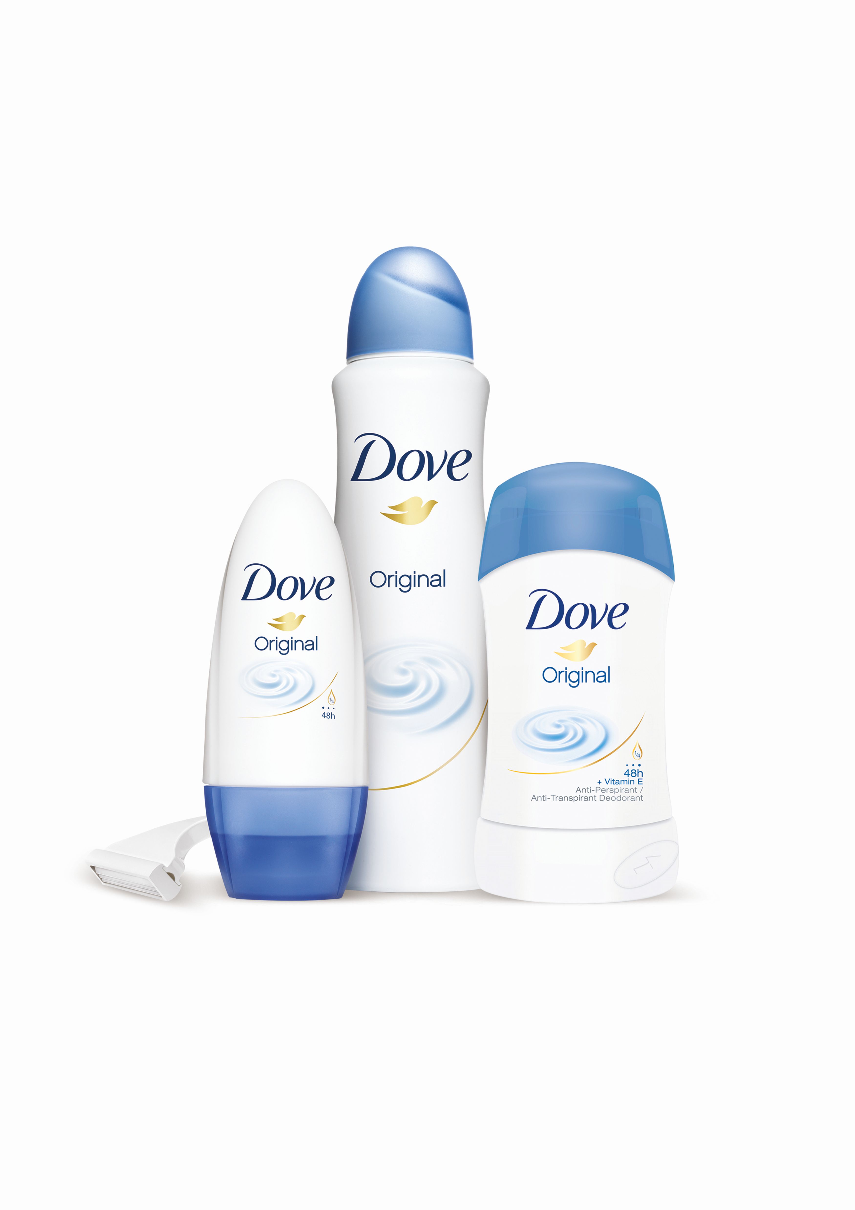 Antiperspirant Dove Original je speciálně vyvinutý pro velice citlivou pokožku podpaží, často namáhanou právě holením. Díky obsahu ¼ hydratačního krému pomáhá regenerovat pokožku a zanechává ji jemnou na dotek. Dále neobsahuje alkohol, takže nedráždí ani po holení a nezpůsobuje nepříjemné pálení. Jeho decentní mýdlová vůně navíc nepřekrývá parfém. Samozřejmostí je i spolehlivá ochrana proti pocení po dobu 48 hodin. Antiperspirant Dove Original lze zakoupit v podobě spreje, tuhého a kuličkového aplikátoru za nezávaznou doporučenou spotřebitelskou cenu 86,90 Kč.