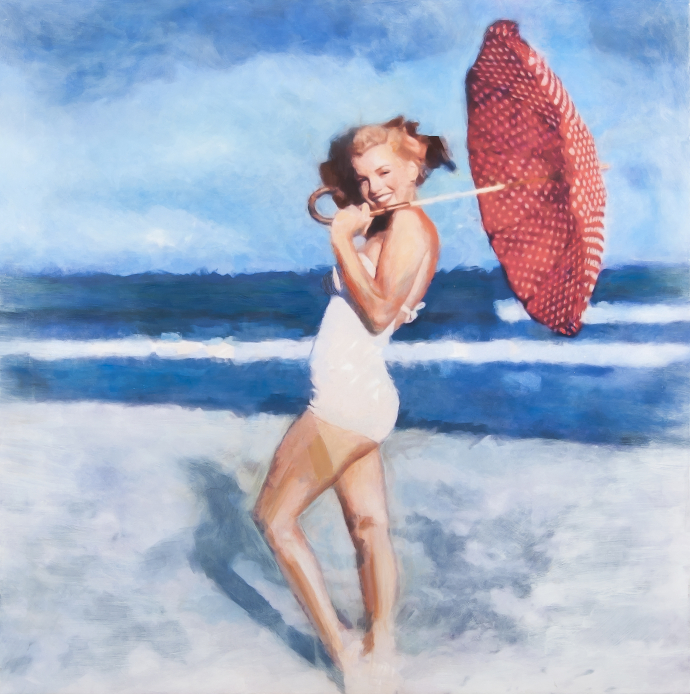 - David Saudek, Marilyn with Umbrella, komb. technika na plátně, dat. 2015, 100 x 100 cm, sign. na rubu, rám.