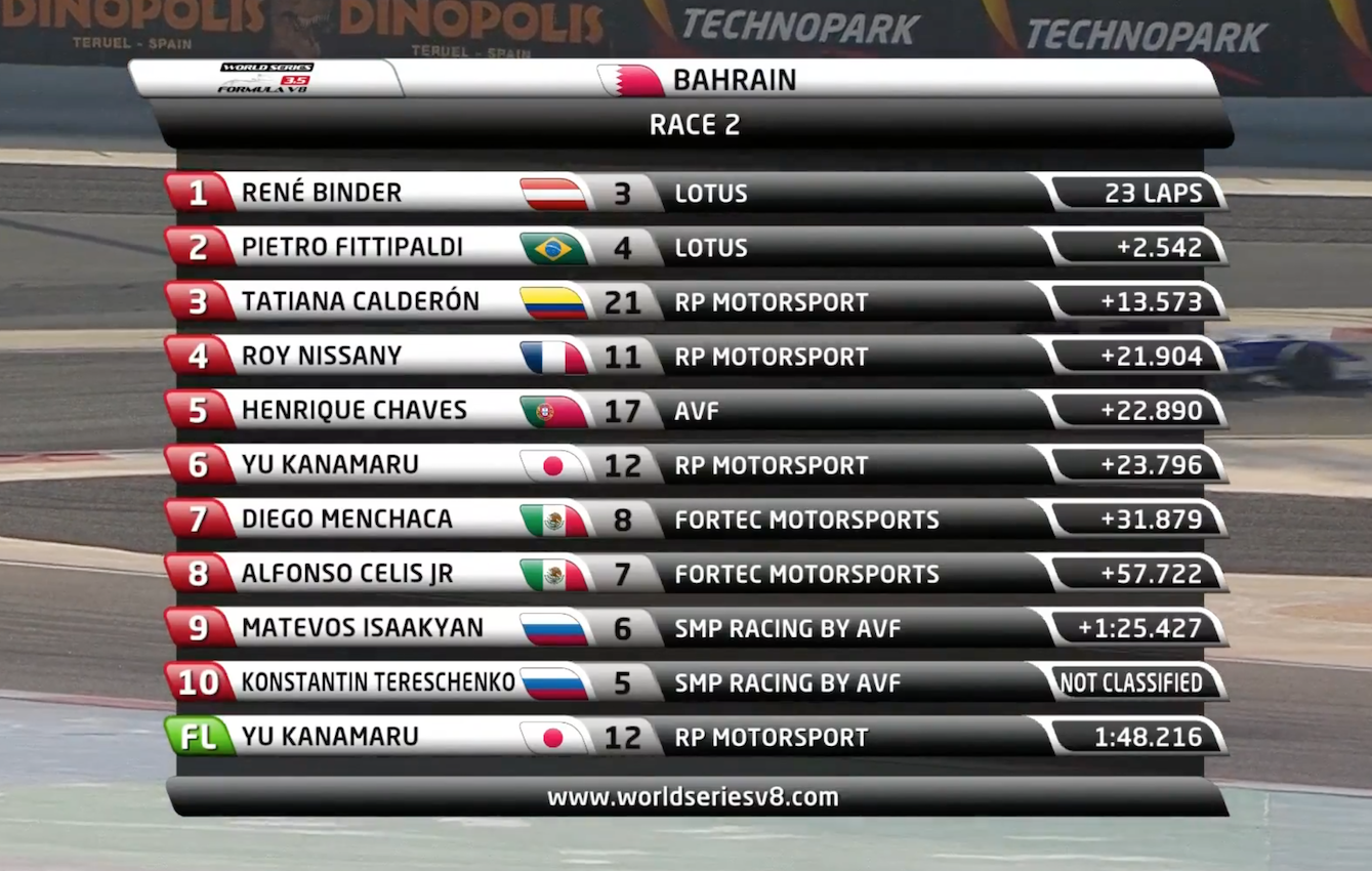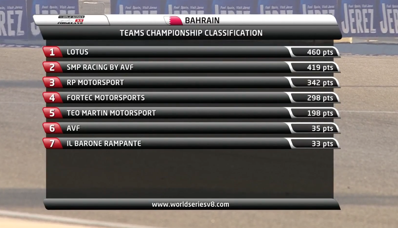 Přesto i druhý závodní den bylo v Bahrajnu o co jet. Ve hře bylo samozřejmě první místo mezi týmy, které před poslední zastávkou seriálu držel SMP Racing. Lotus však nenechal nikoho na pochybách, že právě tato stáj je letos naprostým králem. Od začátku se na čele usadila dvojice René Binder a Pietro Fittipaldi. Tito dva nenechali prakticky nikoho ani pomyslet na to, že by se před ně mohli dostat. Když takto dojeli nakonec i do cíle, bylo rozhodnuto. Nejenže Fittipaldi bere titul mezi jezdi, ale Lotus triumfuje mezi týmy. Tím spíš, že borci týmu SMP Racing zůstali hluboko v poli poražených. „Je to zúročení obrovské dřiny a úsílí všech. Teď si užijeme oslavy,“ měl jasno šéf stáje Bob Vavřík.