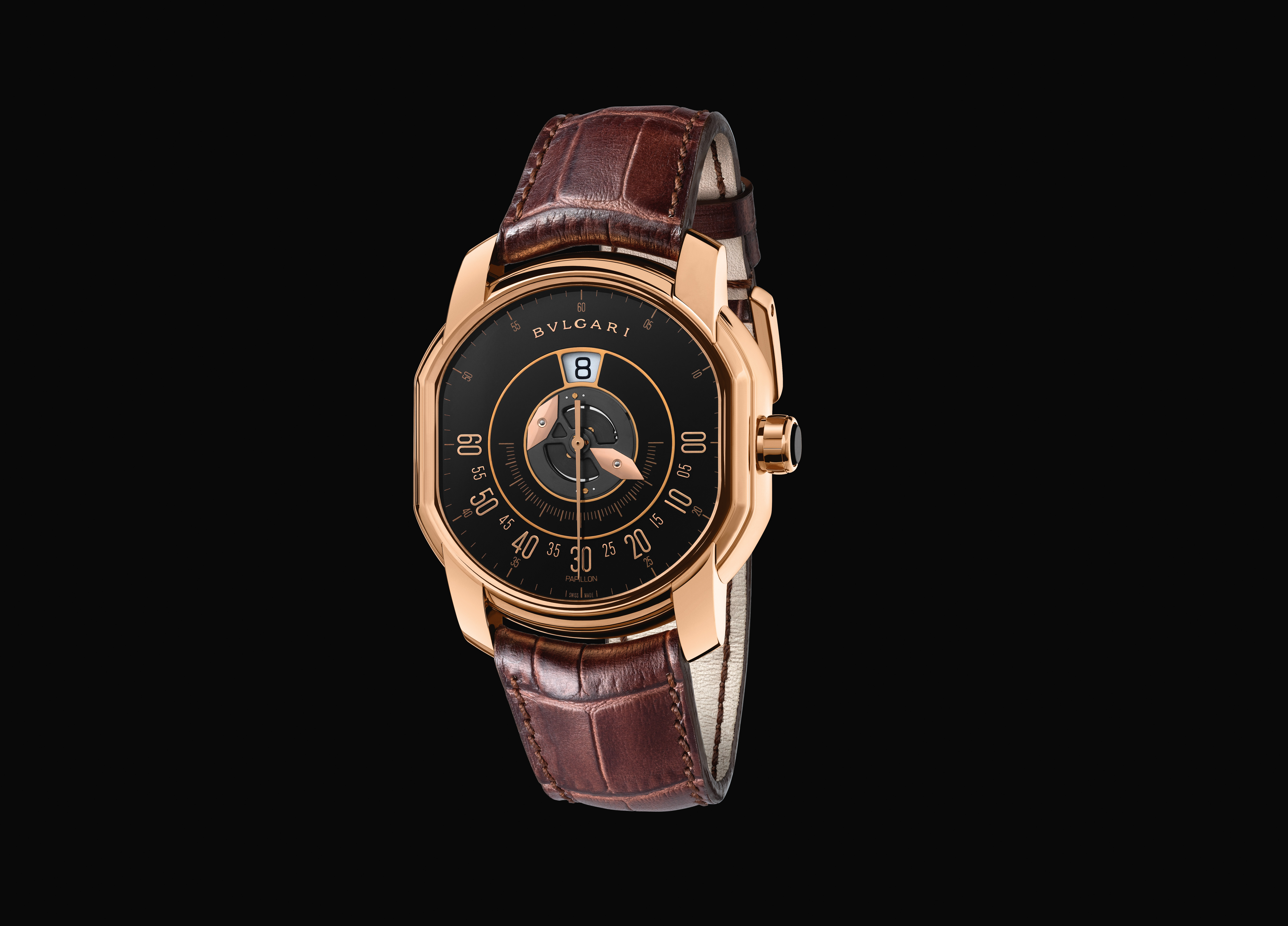 Když aktivní ručka dosáhne indexu 55 minut, druhá ručka se v tu chvíli také zaktivuje a zrcadlí své druhé já ve vodorovné pozici směřující k indexu 00. První ručka tedy předá štafetu druhé a celých 55 minut zůstává v klidové pozici zarovnaná s diskem. Papillon má velkou výhodu, protože je oproti klasickým zobrazením minut úspornější, což pozitivně ovlivňuje rezervu chodu. Tento patentovaný a exkluzivní mechanismus ovšem může být kombinovaný s dalšími komplikacemi. V případě modelu Bulgari Papillon Heure Sautante se navíc jedná o komplikaci jumping hour. Obvod ciferníku také obíhá klasická sekundová ručka. Mechanismus je poháněn automatickým strojkem se samonátahem Calibre BVL 252, který je kompletně vyrobený v manufakturách Bulgari. Strojek s rezervou chodu 42 hodin osciluje na frekvenci 28 800 vibrací za hodinu. Strojek je samozřejmě dekorován motivem Côtes de Genève, charakteristickým podpisem strojků z dílen Bulgari. Vše je uloženo v pouzdře provedeném v 18karátovém růžovém nebo bílém zlatě o velikosti 45 mm s výškou 11,3 mm. Zadní strana hodinek nabízí pohled do útrob strojku díky průhlednému safírovému sklu. Nebyla by to ovšem značka Bulgari, která by se nepokusila posunout se ještě o jeden krok vpřed. Značka pocházející z Říma propojila Papillon s nejprestižnější hodinářskou komplikací, a vznikl tak nový model Bulgari Papillon Tourbillon Central, který je taktéž doplněný komplikací jumping hour. U modelu Papillon Tourbillon Central je tourbillon umístěn ve středu pouzdra, které je provedené v 18karátovém růžovém zlatě nebo platině, podobně jako je diamant osazen v centru šperku, který zdobí. Model vystupuje z řady svou symetrií, čistými liniemi a detailním provedením, a potvrzuje tak, že zaslouženě patří do řady vysoce komplikovaných hodinek.