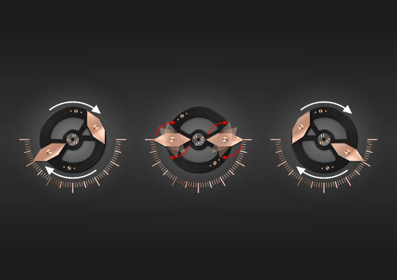 Tento originální mechanismus, inspirovaný letem motýla, je unikátní ve světě Haute Horlogerie a skládá se ze dvou na sobě nezávislých zatahovacích ruček ve tvaru diamantu na podpůrném disku. Každá na střídačku obíhá minutovou škálu rozloženou v půlkruhu o 180 stupních. Zatímco jedna ručka indikuje minuty, druhá ručka se nachází v klidové pozici, a není tak na první pohled na ciferníku okamžitě rozpoznatelná.