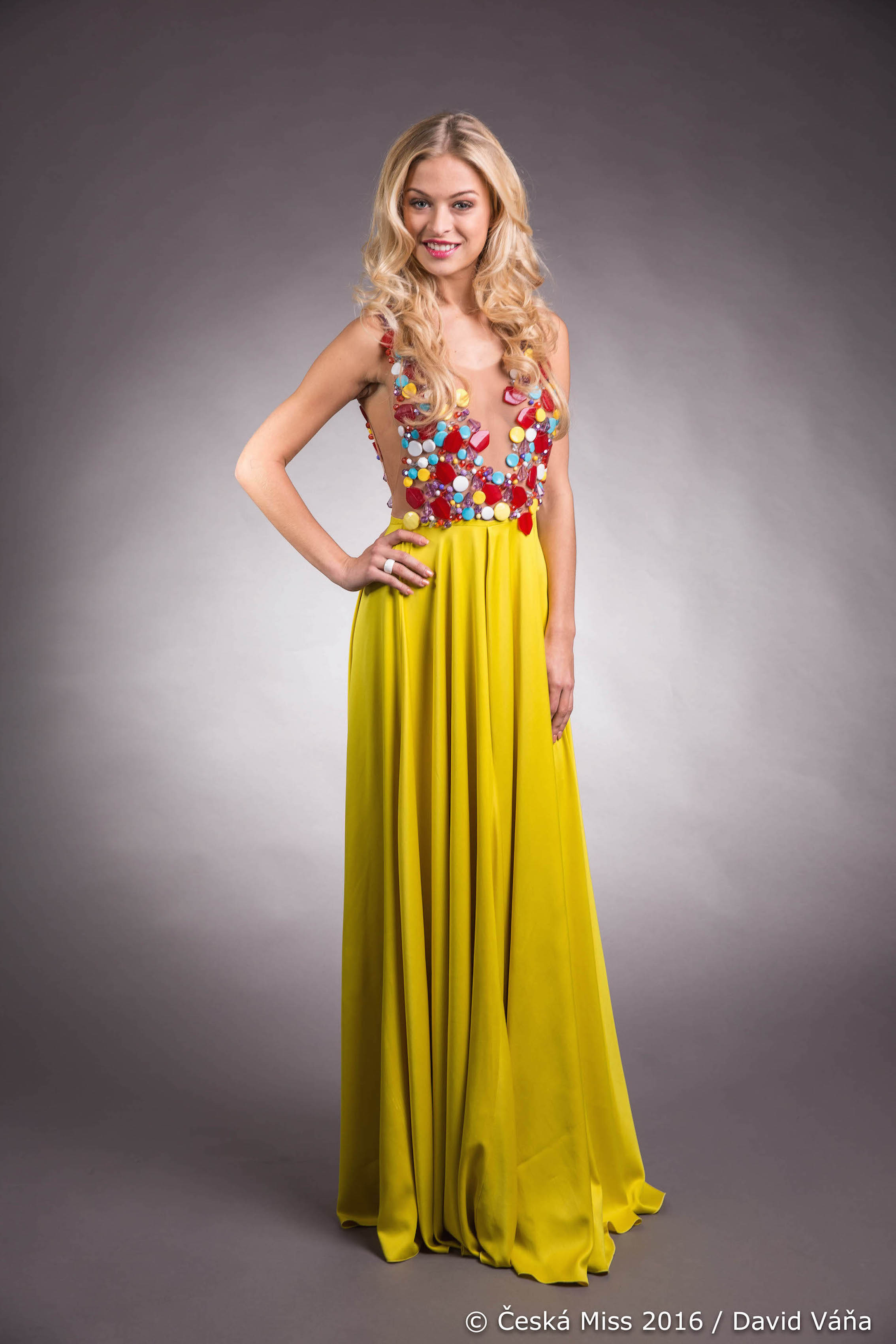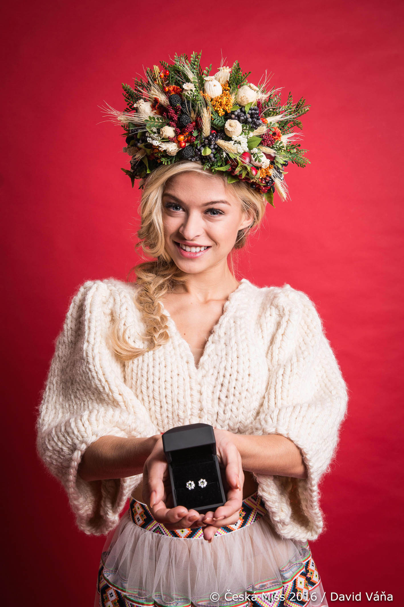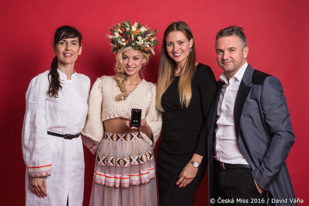 Součástí výbavy je i národní kostým z Rodné Hroudy od Marie Staré, jenž se nese v duchu jihovýchodní Moravy a byl inspirován ornamentem, který se ve vyšívané formě vyskytoval na lidovém kroji z okolí Moravských Kopanic. „Původní oděv byl střihem velmi prostý, avšak ozdoben překrásnými křížovými výšivkami. Ty jsme přenesli na látku a odekorovali tak poloprůsvitnou sukni, která dává vyniknout křivkám modelky. Vrchní část šatů tvoří ručně pletený top od babiček, který je velmi dominantní. Svou jemně krémovou barvou a hrubým vzorem je zajímavým kontrastem k lehounké sukni. Hlava je ozdobena pestrobarevným věnečkem, který je vytvořen z rozmanitých druhů suchých květů a rostlin,“ uvádí Marie Stará, zakladatelka a designerka značky Rodná Hrouda, jejímž cílem je nejen zdobit krásné ženy, ale také pomáhat. Tvorba národního kostýmu má charitativní podtext a stala se součástí projektu zpříjemňujícího život seniorům v Domově Na Zámku v Lysé nad Labem. Šaty budou po světové soutěži krásy Miss Earth 2016 vydraženy.