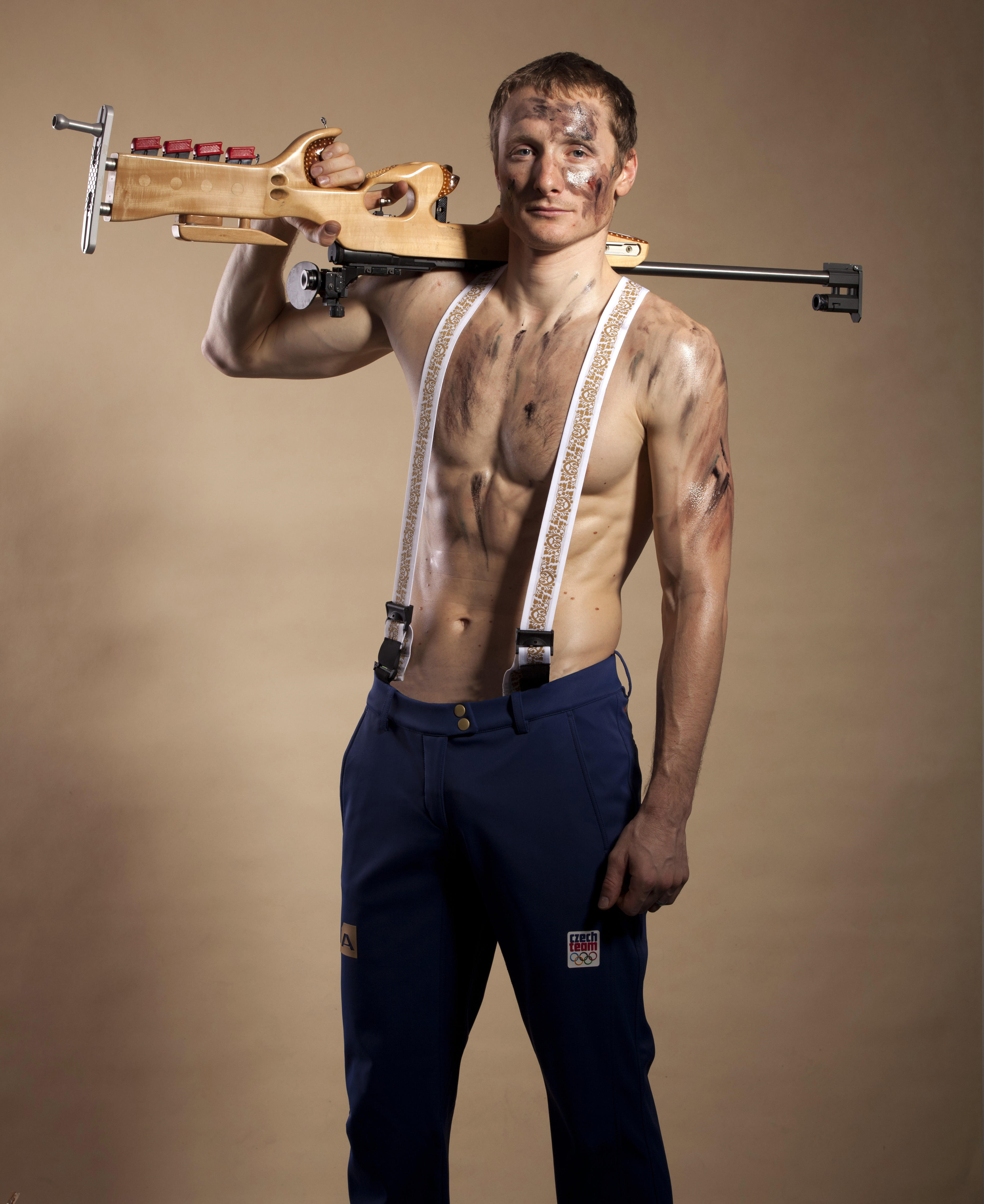 Ještě před odletem se dvanáctka českých medailových nadějí na chvíli zastavila a ve Slovinské Pokljuce, kde se připravovali na olympijské hry, nafotili originální kalendář ve stylu národních hrdinů. Předchůdce biatlonu vznikl už v 18. století v Norsku, v roce 1924 se pak poprvé objevil pod pěti kruhy coby nový olympijský sport. Dnes je celosvětová popularita biatlonu na takové úrovni, že i běžec na lyžích Lukáš Bauer uznal: „Už je atraktivnější než samotné lyžování.“ Náboj biatlonu přináší jeho nepředvídatelnost, kdy i jasného lídra může chyba na střelnici odsoudit k prohře. Popularitu v Česku si lyžařsko-střelecký dvojboj získal především díky úspěchům Gabriely Soukalové. Povedenější sezonu, než byla ta loňská, český biatlon dlouho nepamatuje. „Musím říct, že se se všemi sportovci spolupracovalo výborně. Byli naprosto profesionální a neměli žádné hvězdné manýry. Třeba Gábina Soukalová do ateliéru přispěchala ještě s puškou v ruce, rovnou z tréninku,“ uvedl marketingový ředitel Alpine Pro Petr Billy.