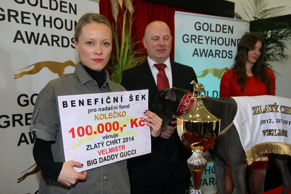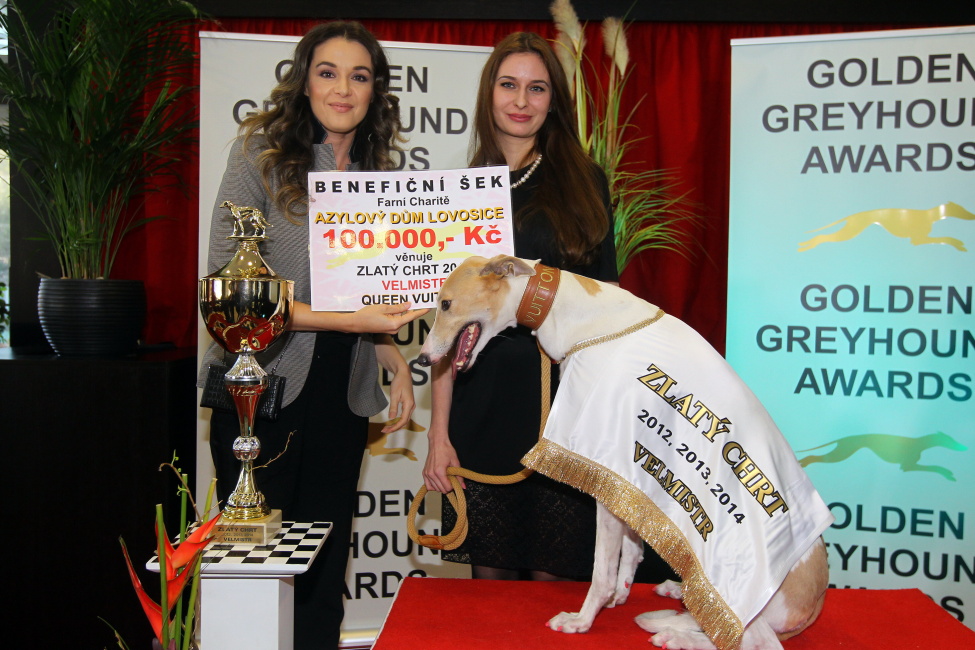 Chrti ale nejsou jen skvělými sportovci s famózní pedikúrou, ale jsou i dobrosrdečnými dárci. Celou svou velmistrovskou výhru totiž oba vítězové věnovali na dobročinné účely. Queen Vuitton věnovala šek v hodnotě sto tisíc korun symbolicky Ivě Kubelkově, která zastupovala Azylový dům Lovosice, který dlouhodobě podporuje. „Každá žena se může dostat do situace, ve které si nikdy nepřála být. Ze dne na den se může díky nepříznivé životní situaci ocitnout bez střechy nad hlavou a to jak sama, tak se svými nezaopatřenými dětmi. Cílem našeho projektu je poskytnout těmto ženám ubytování, které ale musí někdo financovat. Proto jsem velice vděčná všem, kteří nemyslí jen na svůj blahobyt a takovéto projekty podporují,“ poděkovala České greyhound dostihové federaci Iva Kubelková. Občas se o chrty pečuje lépe než o lidi, a proto chtěli v rámci svých možností pomoci. Velkolepý dar ve stejné hodnotě daroval i Big Daddy Gucci Lindě Rybové pro Nadační fond Kolečko, jehož je patronkou. „Chtěla bych moc poděkovat chrtům za jejich ohromný dar pro naši nadaci. Snažíme se pomáhat dětem postiženým následky dopravních nehod, nebo jiným úrazem a zmírnit fyzické, psychické a sociální dopady, které s tím souvisejí. Finanční dary v takovéto výši nám v naší snaze nesmírně pomáhají a musím přiznat, že se těším, doktorům a dětem vyprávět, že na potřebné vybavení tentokrát přispěli pejsci, že to prostě pro Kolečko a hlavně pro ně vyběhali chrti.,“ sdělila věčně usměvavá Linda Rybová.