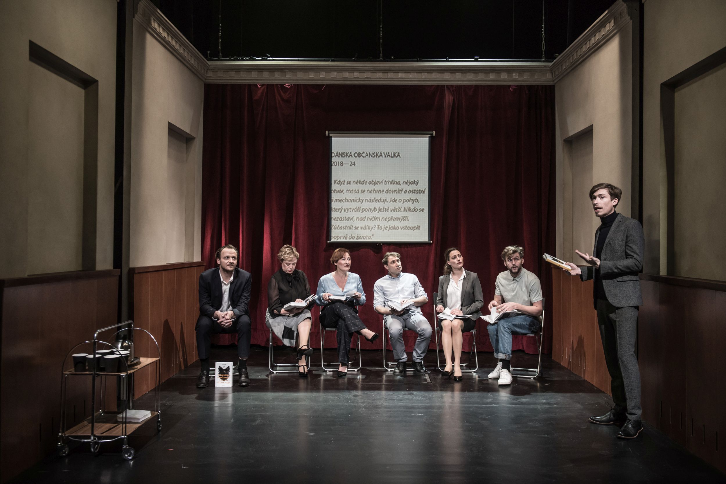 Premiérový titul Dánská občanská válka 2018–2024 Na zábradlí inscenuje nová divadelní generace, čerství absolventi DAMU, režisérsko-dramaturgický tandem Adam Svozil – Kristýna Kosová. Jde o jejich první spolupráci s legendární pražskou scénou. V hlavních rolích se představí Jiří Černý, Honza Hájek, Petr Jeništa, Dita Kaplanová, Miloslav Konig, Johana Matoušková a Magdaléna Sidonová – ve velmi nečekaných polohách a ve scénografii Petra Vítka a kostýmech Jána Tereby.