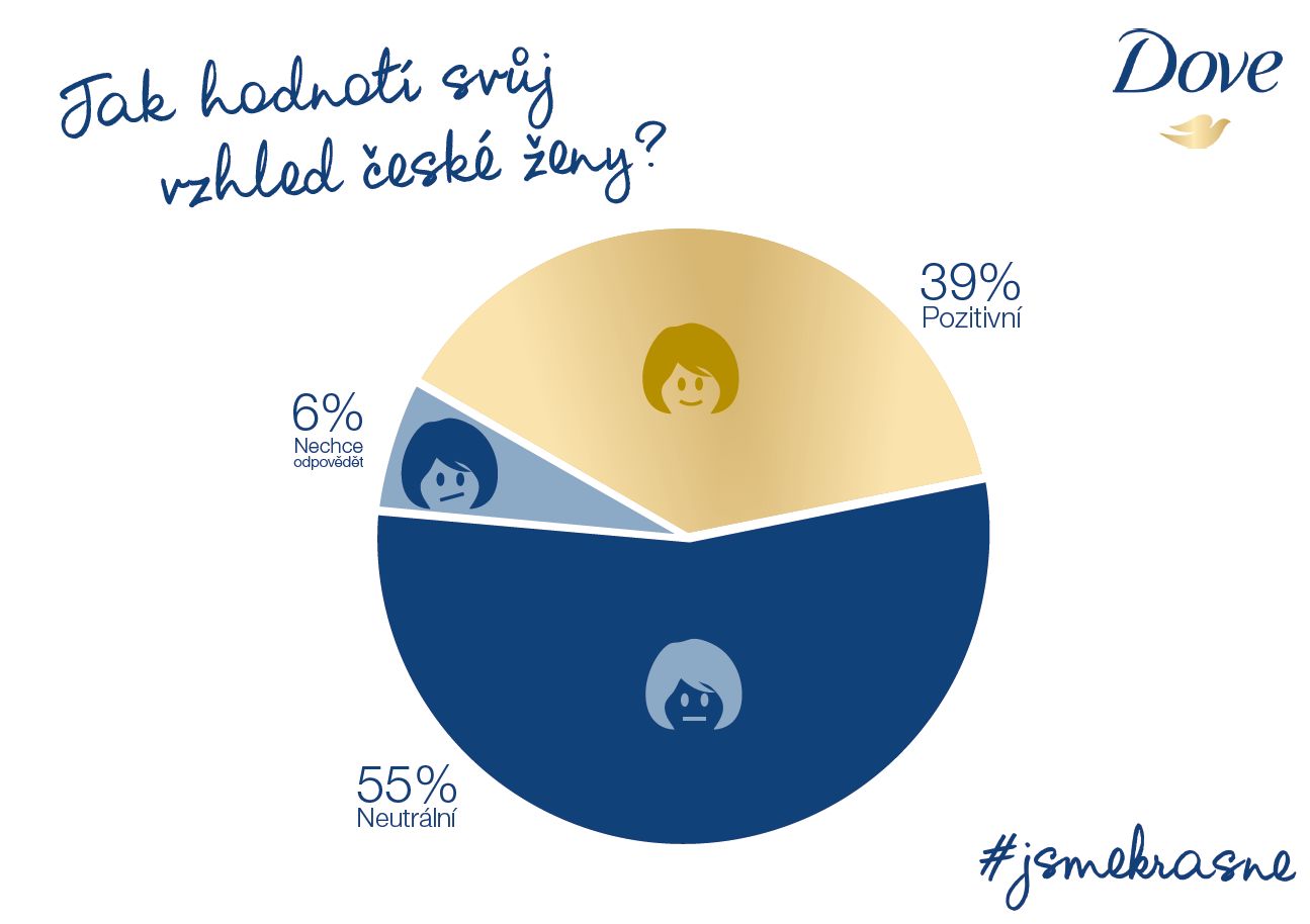 Češky hodnotily svůj vzhled v aktuálním průzkumu* značky Dove a ve většině případů se popsaly skromně či neutrálně jako průměrné (22 %), dobře vypadající (18 %) nebo přírodní (17 %). Coby krásné se vidí jen 1 % z dotazovaných, téměř 70 % ale přitom tvrdí, že většina žen si není vědoma své skutečné krásy. Značka Dove jim chce pomoci vidět svoji krásu, a díky tomu získat větší sebedůvěru. „Člověk si musí uvědomit, kdo je, a být na to hrdý. Pokud máme rádi sebe sama po fyzické i psychické stránce, pak jsme zdravě sebevědomí. Když jsme naopak nespokojeni a hodnotíme se kriticky, hromadí se v nás negativní emoce a stres, který má zásadní dopad i na naše zdraví,“ uvedla psycholožka a koučka Mgr. Jitka Nesnídalová.
