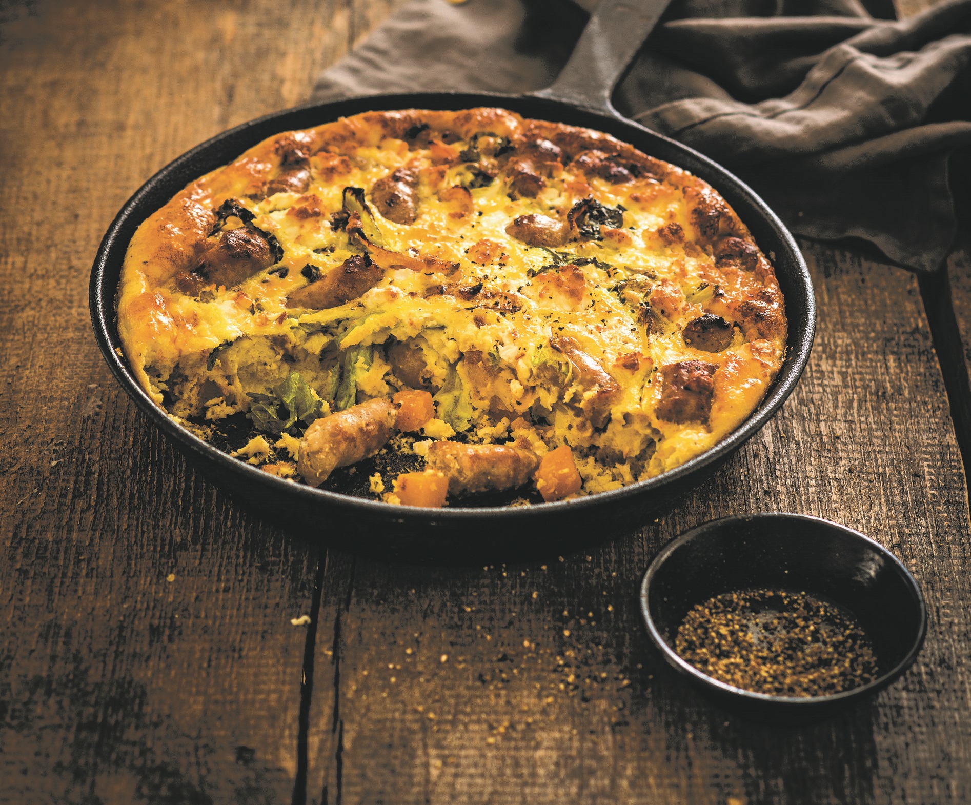 Předehřejte troubu na 200 °C. Červenou cibuli nakrájejte na měsíčky a nechte pozvolna zkaramelizovat na rozehřátém oleji v pánvi s kovovou rukojetí, kterou je možné vložit do trouby. Přidejte nakrájenou dýni a klobásu, osolte a opečte doměkka. Po chvíli přihoďte nakrájenou kapustu a ještě pár minut opékejte.