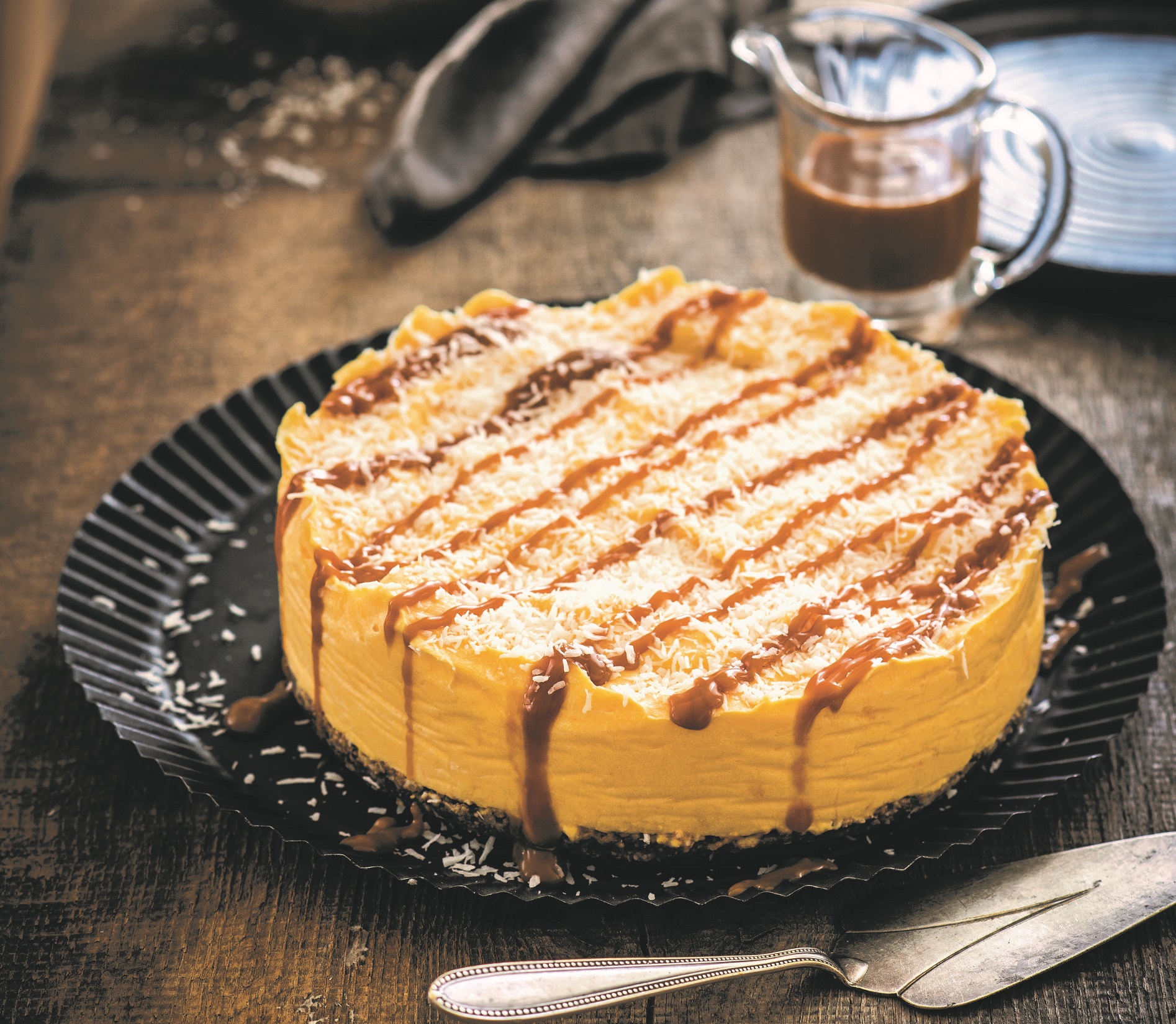 Ostrým nožem opatrně projeďte po okraji dortu a uvolněte ho z formy. Podávejte posypané kokosem a přelité karamelovou omáčkou.