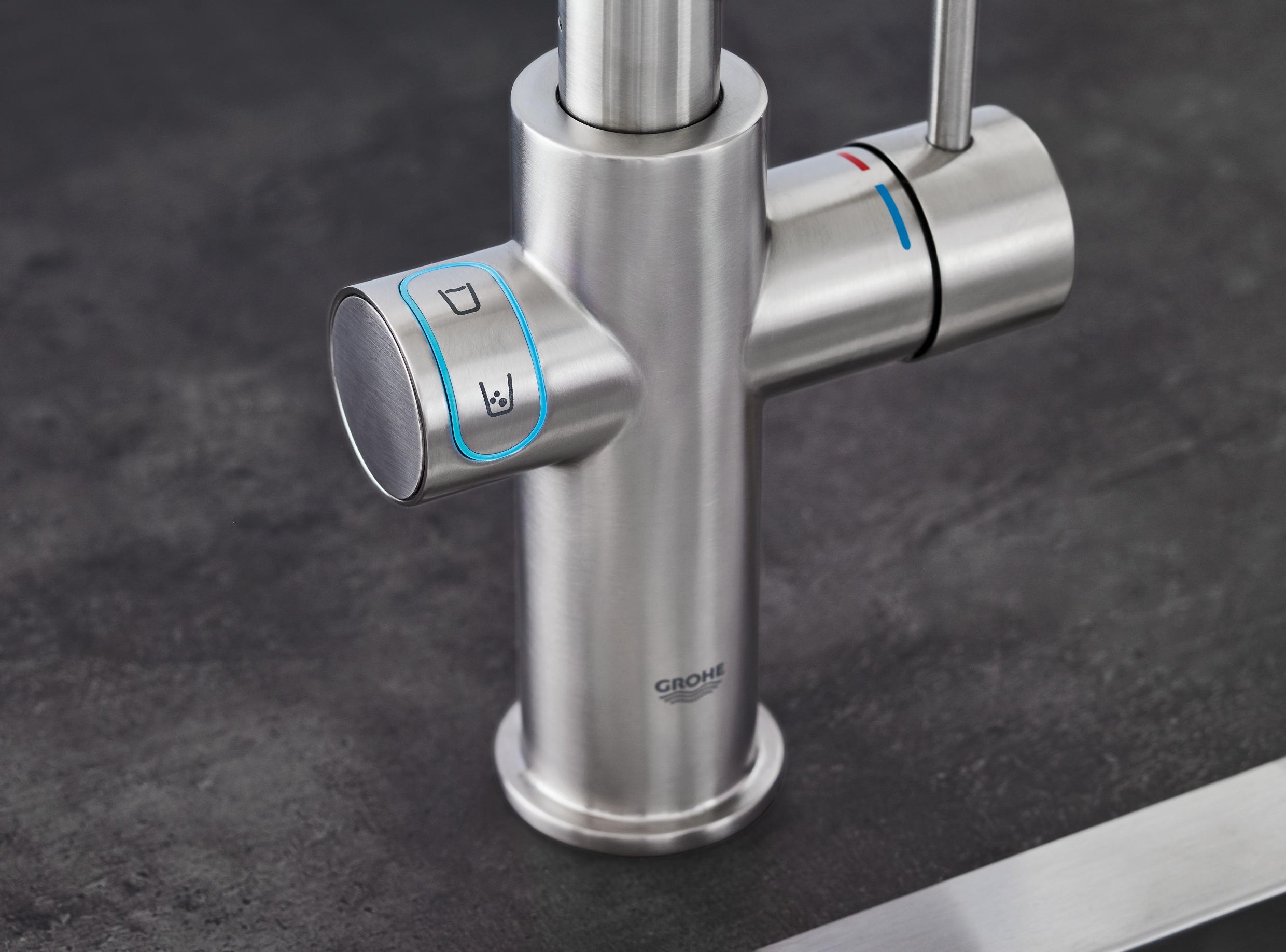a nakládat vaše auto po okraj těžkými lahvemi s balenou vodou, abyste měli zásoby na další týden. Místo toho budete mít zdroj osvěžující, filtrované vody v podobě stylové kuchyňské baterie, která vám vždy poskytne vodu vychlazenou na tu správnou teplotu, perlivou, jemně perlivou nebo neperlivou. Přivítejte revoluci v kuchyni. Představujeme systém GROHE Blue® Home.