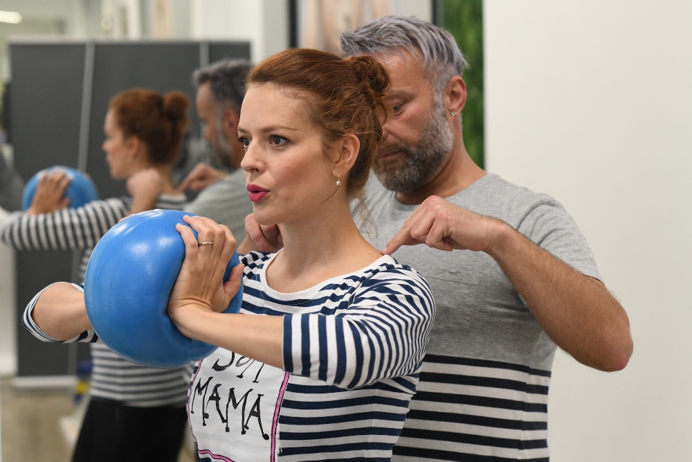 Herečka a fotografka Andrea Růžičková se netají tím, že jí trápí problematické partie v oblasti stehnou. „Trenink pod vedením Ladislava Zeithamla mi vyhovuje ve všech ohledech. Cvičíme spolu už dlouho, chodila jsem k němu i v těhotenství, dokonce mi byl velkou oporou i při porodu. Teď začínáme po šestinedělí a už po pár hodinách vidím výsledky,“ říká maminka syna Tobiáše. Herečku Lenku Zahradnickou trápí bolest zad a tak se s Láďou zaměřují hlavně na zpevnění zádového svalstva.