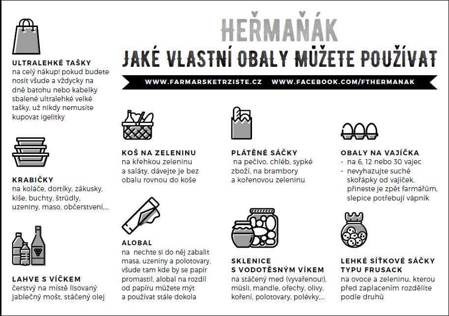 Stále větší množství Čechů se hlásí k životnímu stylu bez obalů, jehož filozofií je produkovat co nejméně odpadu. Kromě jiného i nákupem do vlastních obalů. Od loňského podzimu mají možnost do vlastních nádob, sáčků nebo tašek nakoupit na farmářském trhu Heřmaňák.