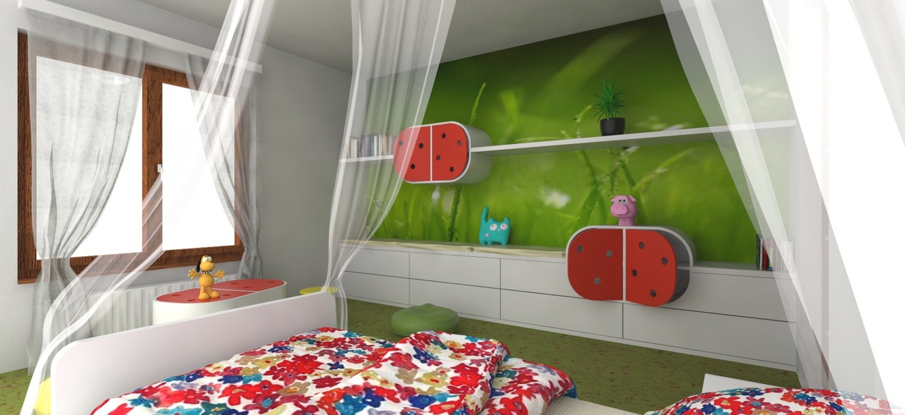 Ukládání šatů a hraček. Myslete dopředu – batole sice zatím oblékáte vy, za pár let ale oceníte, když na všechny potřebné svršky dosáhne samo a nebude potřebovat vaši asistenci. Úložných prostor na všechny hračky, výtvarné potřeby, knížky a další věci je vždy nedostatek, proto je nejlepší nechat si navrhnout nábytek na míru aby bylo místo v pokojíku maximálně využito. Přitom by měl zůstat dostatek volné plochy na hraní.