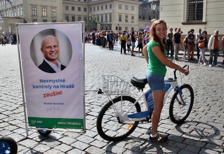 „Možná, že tu pan prezident vede statistiku, kolik lidí projde branou, a aby tu nemuseli stát pikolíci nebo studentíci, udělali detekční rámy a prohlídky a každého evidují,“ usmíval se další z příchozích, pan Zbyněk z Olomouce.  „Zruším nesmyslné kontroly na Hradě,” říká hlasitě Michal Horáček. „Je to jen šikana občanů, turistů a stojí to zbytečné peníze. A pokud něco skutečně teroristy naopak přitahuje, jsou to právě fronty, davy turistů,” namítá kandidát na Hrad. Kontroly na Hradě byly zavedeny jako prevence bezpečnosti údajně proti možnému terorismu, nicméně doposud nikdo neprokázal, že by byly opodstatněné. Několik týdnů dokonce jezdí na Hradčanech a v jeho okolí mladá, krásná slečna na kole s transparentem, který hlásá tento slib zrušení kontrol a upozorňuje tak na nesmyslnost opatření. „Podle čeho se pozná chlap? Drží slovo a plní sliby. Pro českého prezidenta to musí platit bezvýhradně,” podotýká Horáček.
