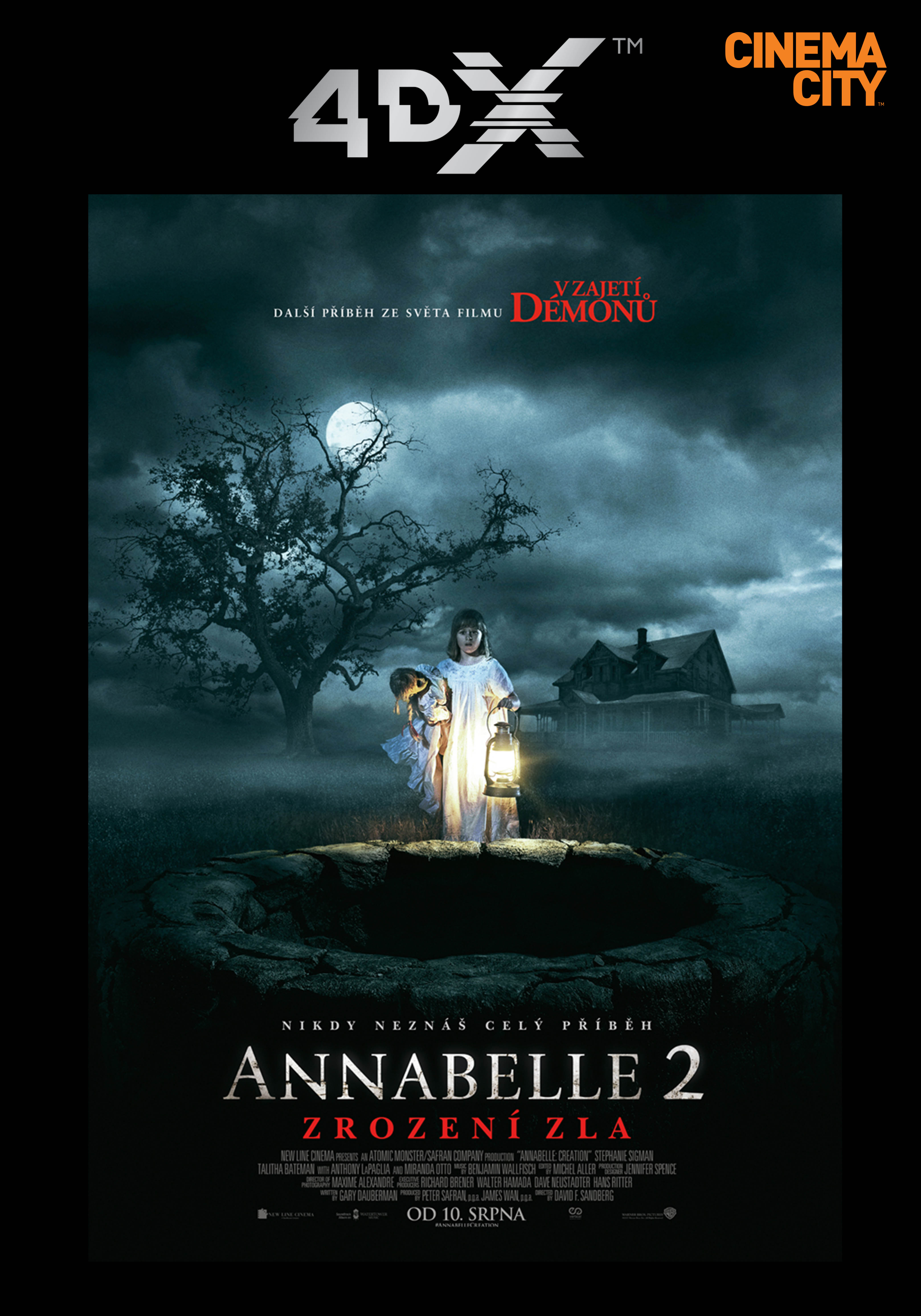 Buďte u toho – historicky první horor promítaný ve speciálním kině 4DX, již o půlnoci z 8. srpna na 9. srpna 2017 v kině 4DX! Annabelle 2 : Zrození zla je pokračováním velmi úspěšného hororu z roku 2014 „Annabelle“. V tomto napínavém snímku výrobce panenek se svou manželkou přijmou několik let po tragické smrti jejich dcerky do svého domu řádovou sestru a několik dívek ze zavřeného sirotčince. Zanedlouho se však stanou terčem aktivit Annabelle, posedlého výtvoru výrobce panenek. Děsivý příběh ještě děsivěji vyhlížející panenky Annabelle si oblíbily miliony diváků po celém světě a na jeho pokračování se do kina třese nejeden filmový nadšenec.