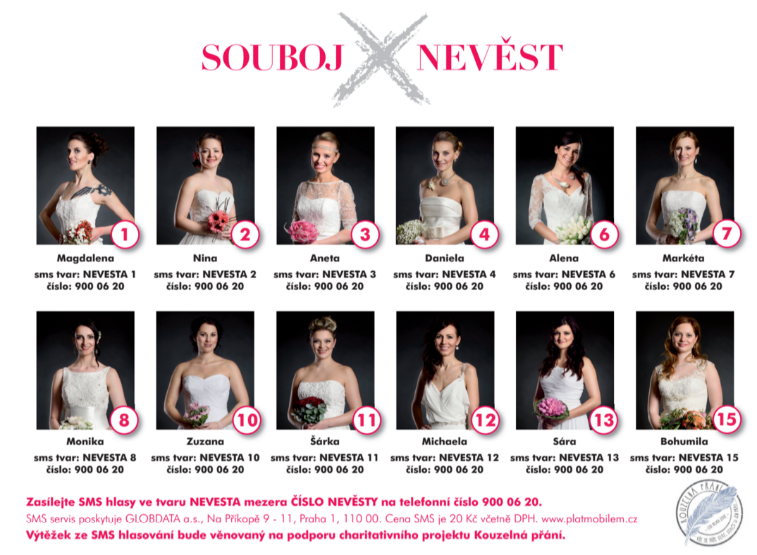 A právě proto, aby „den D“ byl dokonalý, můžou si nevěsty spoustu darů vysoutěžit v již pátém ročníku jedinečné soutěže Souboj nevěst. Patronátu nad letošními finalistkami se ujaly budoucí nevěsta, moderátorka a Česká Miss 2013 Gabriela Kratochvílová a herečka Ivana Jirešová. Šaty od návrhářky Alice Abraham, exkluzivní kolekce spodního prádla francouzské značky YOKA SOLA, ubytování v luxusním pražském hotelu THE GRAND MARK PRAGUE, snubní prsteny, koordinace svatby, květinová výzdoba, svatební cesta či jedinečný film o životě snoubenců, nejen toto získá letošní vítězka Souboje nevěst. „Jsem moc ráda, že se nám podařilo uspořádat již pátý ročník, máme s celým týmem obrovskou radost, když se nám soutěžící z již předešlých ročníků ozývají se svými zážitky ze svatebních dnů,“ uvedla zakladatelka soutěže Lucie Kopecká.