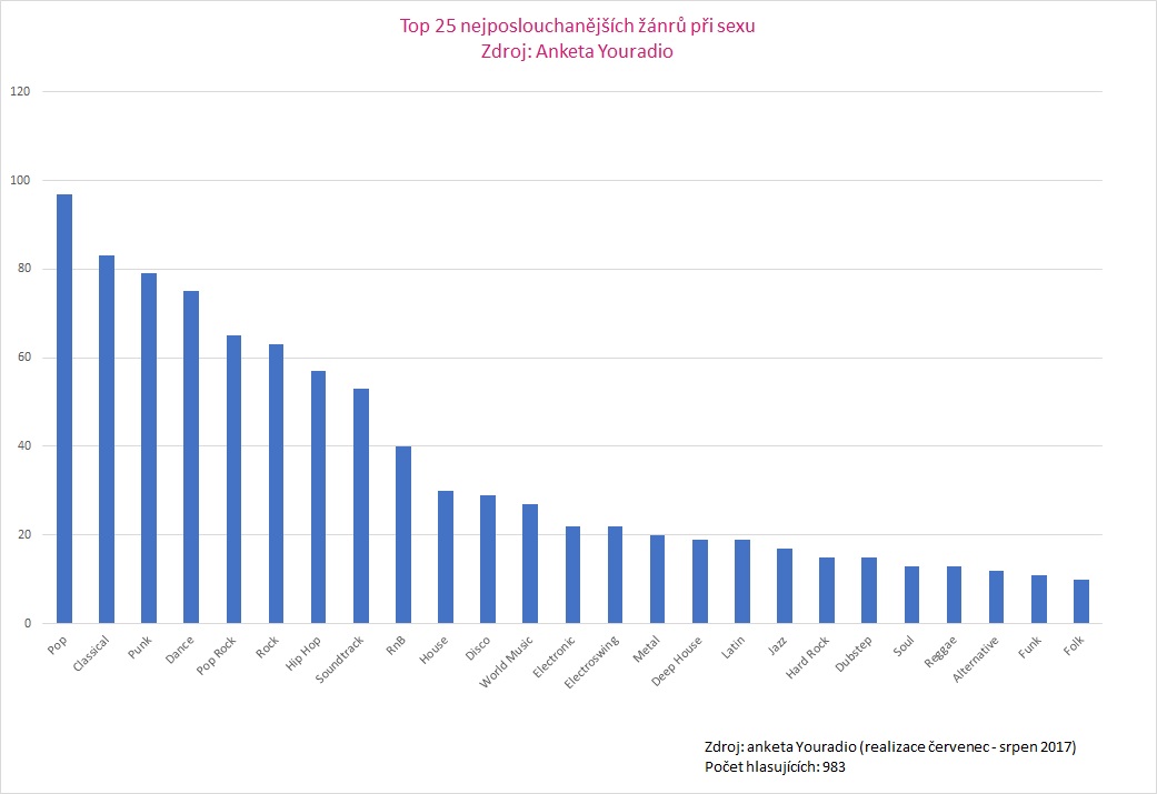 Youradio, česká hudební aplikace pro poslech streamované hudby v mobilu, zrealizovala v průběhu prázdnin netradiční anketu, do níž se zapojilo téměř tisíc respondentů. Účast v anketě byla motivována soutěží o zásobu kondomů na půl roku a vouchery na prémiovou verzi hudební služby Youradio. Jaký hudební žánr lidé preferují při sexu? Téměř tisícovka respondentů volila mezi několika žánry a mohla navrhnout i vlastní tip. V první desítce se umístily žánry jako pop music, klasika, punk, dance, hip hop, house a další, pro které hlasovalo zhruba 700 respondentů. Mezi ostatními tipy respondentů se pak objevila i řada kuriozit.