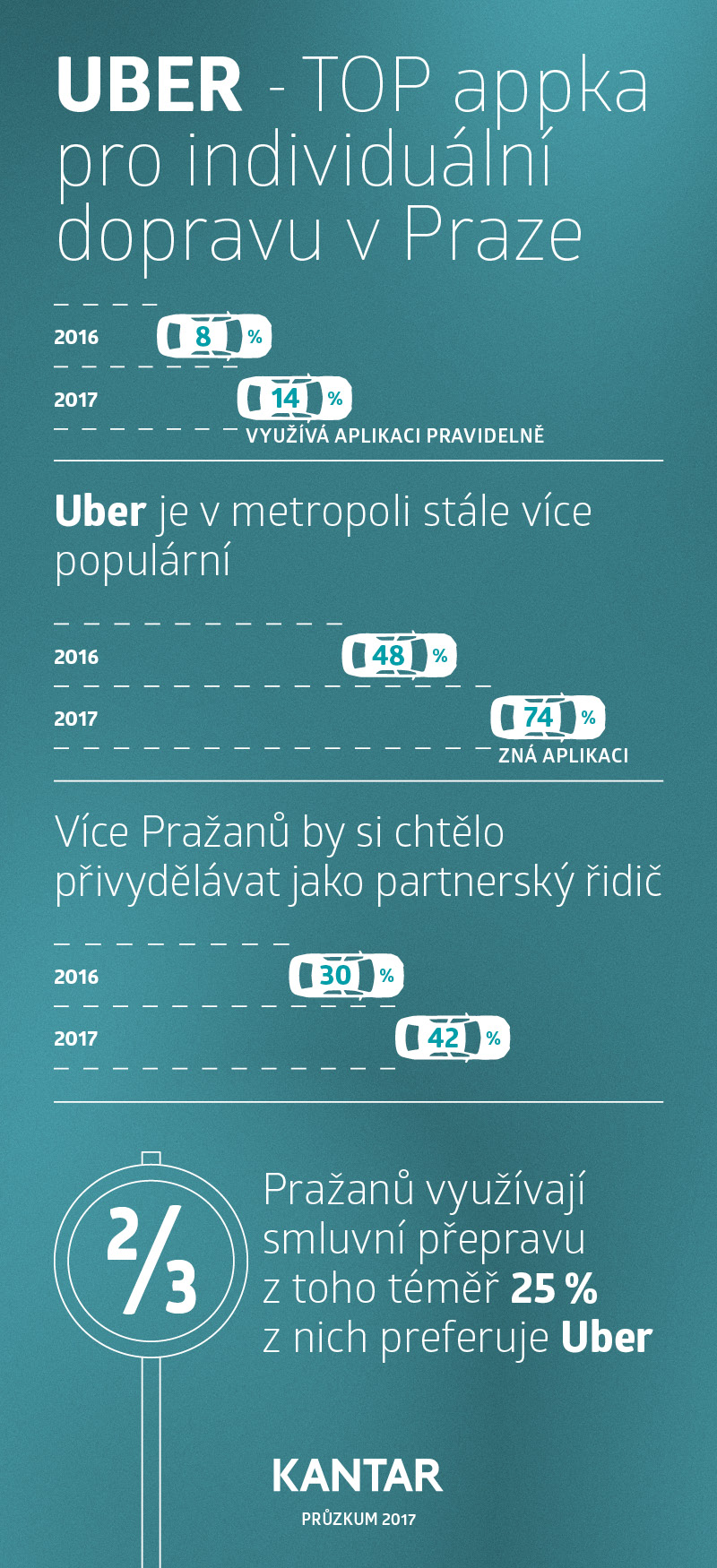 Obyvatelé metropole v reprezentativním průzkumu veřejného mínění jednoznačně potvrdili, že Uber nejen nabízí přesně ten typ služeb, který na trhu dlouhodobě chyběl, ale díky novátorskému přístupu s důrazem na svobodnou volbu spotřebitelů, zdravou konkurenci a přirozenou soutěživost dokáže vyřešit největší neduhy trápící trh individuální smluvní dopravy v Praze. Důkazem toho je, že za poslední rok podle Kantar TNS narostl počet obyvatel Prahy, kteří pravidelně využívají smluvní osobní přepravu, na téměř dvě třetiny (64 %) – přitom v loňském roce to bylo pouhých přibližně 46 %. Pražané fandí moderním technologiím, více než polovina (53 %) respondentů proto ve výzkumu potvrdila, že je pro ně důležitější vidět v aplikaci, jaký vůz (SPZ, značka a model) a jaký řidič pro ně přijede, než to, aby byl vůz samotný označen cedulí TAXI (21 %).