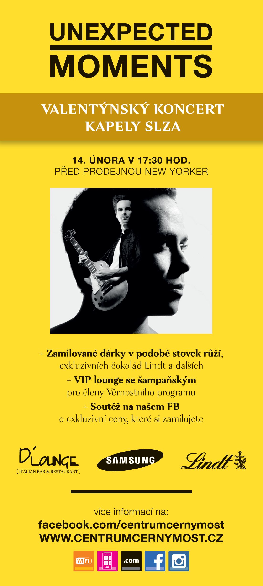 Koncert kapely Slza, kterou tvoří kytarista Lukáš Bundil a zpěvák Petr Lexa, bude v Centru Černý Most zahájen v 17:30 hodin. Hudební stage bude umístěna v přízemí, před prodejnou New Yorker. Duo Slza tentokrát zahraje akusticky a svými nejznámějšími hity tak navodí tu správnou romantickou atmosféru, jež k svátku všech zamilovaných neodmyslitelně patří.