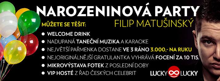 V praxi to znamená, že nejlepší pařmenka dostane ve tři ráno tři tisíce korun českých v hotovosti na ruku. A proč vše startuje právě tuto sobotu? Odpověď je jednoduchá. 1. března se totiž v klubu koná oslava narozenin jednoho z předních českých fotografů Filipa Matušinského. Lucky Lucky tak bude plný nejen super zábavy a akčních drinků, ale také známých tváří našeho showbyznysu. Navíc Filip slíbil, že pokud se najde dívka, slečna, žena či dáma, která ho dokáže „uchlastat“, nafotí jí zdarma exkluzivní fotoset, za který by jinak zaplatila 10 000 Kč. Navíc, nejoriginálnější gratulant večera vyhraje to samé – tedy možnost nafotit super fotky. Vše vypukne ve 21. hodin, na kompletní program klubu se můžete mrknout zde: http://luckylucky.cz/. Dorazte, vstup je zdarma!