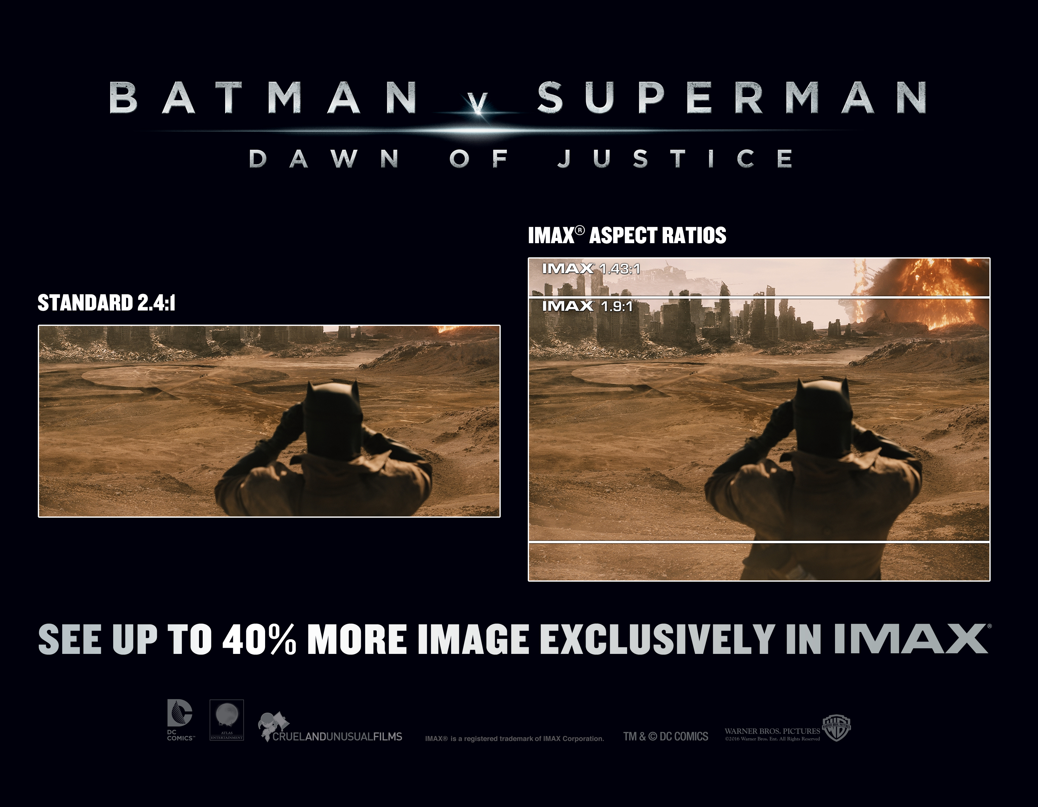 Ovšem naprostý top filmový zážitek na vás čeká, pokud Batman v Superman: Úsvit spravedlnosti navštívíte v kině IMAX. Ocitnete se tak přímo po boku superhrdinů, protože největší plátno v České republice vám nedovolí podívat se jinam. Tento snímek je navíc speciálně natočen v super verzi pro kino IMAX, a to v 1.9:1 oproti normálním obrazu, který je ve verzi 2. 4:1. Divákovi tak nabídne o celých 26 % větší obraz, což už stojí za vidění.