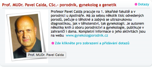 „Smyslem existence webu ABCtěhotenstvi.cz je poskytovat ověřené informace, články na odborná témata,  kterým by porozuměla každá žena. Proto jsem rád, že se mohu podílet na tvorbě obsahu tohoto webu, ale také, že mohu v poradně odpovídat na dotazy, spolu s dalšími zkušenými lékaři, porodními asistentkami, psychologem, genetikem a odborníky z dalších profes,“ říká Prof. MUDr. Pavel Calda, CSc., z 1. Lékařské fakulty university karlovy a všeobecné fakultní nemocnice v Praze.