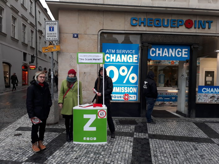 Po 4 dnech nenásilné informační blokády možná nejhorší směnárny v Praze potažmo v Česku, která z důvěřivých turistů dlouhé roky lákala eura, za která jim dávala pouhých 15 Kč, slaví organizátoři kampaně Centrum bez šmejdů (www.centrumbezsmejdu.cz) první úspěchy. Hlavním cílem kampaně v tuto chvíli zůstává vyvinout tlak na poslance České republiky k urychlené novelizaci zákona o směnárenské činnosti směrem k posílení pravomocí zákazníků směnáren a regulaci kurzů.