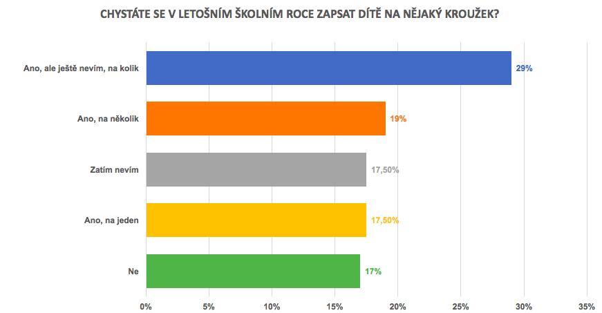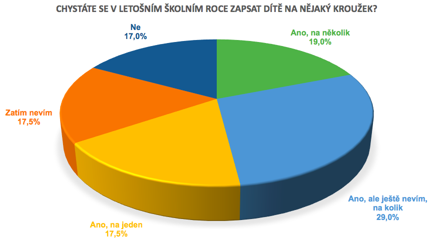 V novém školním roce určitě přihlásí své dítě na zájmový kroužek více než 6 z 10 rodičů, pětina rodičů se dítě chystá zapsat hned na několik aktivit. Nejdůležitější při rozhodování jsou pro rodiče preference dítěte (61 %) a prospěšnost a potenciál kroužku pro jeho rozvoj (58 %), významnou roli hraje také fakt, zda je kroužek či oddíl v blízkosti bydliště (45 %). Náklady na provozování kroužku jsou při rozhodování zásadní ve třetině rodin, naopak vlastní zkušenost rodičů s danou aktivitou roli nehraje téměř vůbec. Polovina rodičů utratí za kroužky pro jedno dítě do tří tisíc korun ročně, dalších 40 % rodičů se vejde do částky 7 tisíc korun za rok. V průměru nejvíce peněz do kroužků investují rodiče ve Středočeském, Ústeckém, Jihomoravském kraji a v hlavním městě.