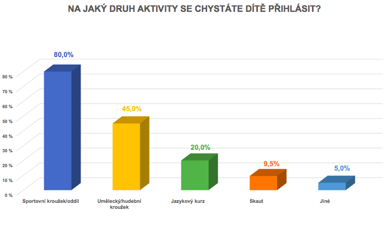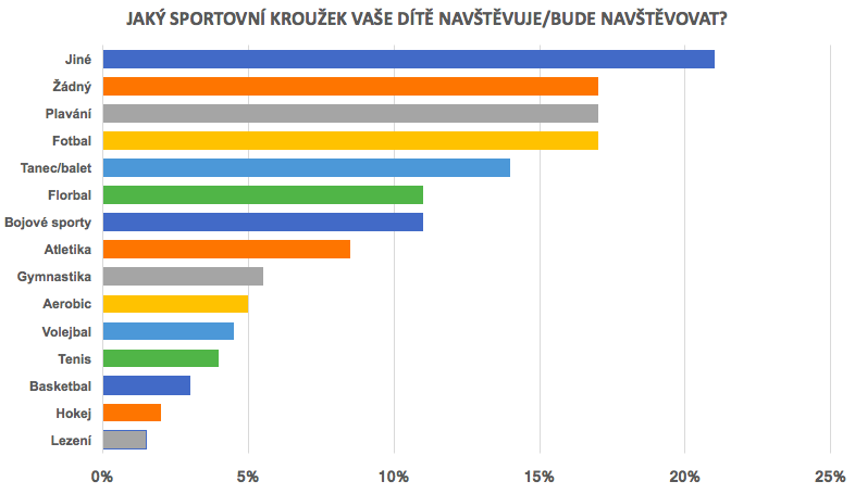 Osmdesát procent rodičů pro své děti volí sportovní kroužky a oddíly, necelá polovina hudební nebo jiný umělecký kroužek, pětina jazykový kurz. Zhruba každé desáté dítě pak chodí do skauta. Mezi neoblíbenější sportovní kroužky v České republice patří fotbal (17 %), plavání (17 %) a tanec či balet (14 %), následují florbal (11 %) a bojové sporty (11 %). Většina českých dětí sportovní kroužky navštěvuje nebo bude navštěvovat čistě zájmově, bez účasti na jakýchkoliv turnajích nebo soutěžích. Závodně na okresní či krajské úrovni sportuje 35 % dětí a zhruba každý desátý malý sportovec či sportovkyně soutěží na národní nebo mezinárodní úrovni a 1 % českých dětí sportem vydělává