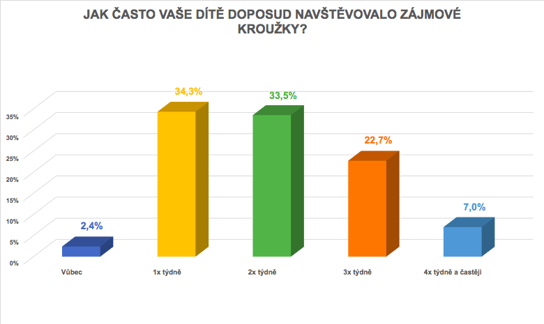 Přes 60 % českých dětí začíná s kroužky ještě před nástupem do první třídy nebo souběžně se začátkem školní docházky. Každé desáté dítě si zájmové aktivity vyzkouší ještě před dovršením 4 let věku. Třetina českých dětí má kroužky jednou týdně, dalších 30 % dvakrát týdně. Každé jedenácté dítě se mimoškolním aktivitám věnuje 4x týdně a častěji.