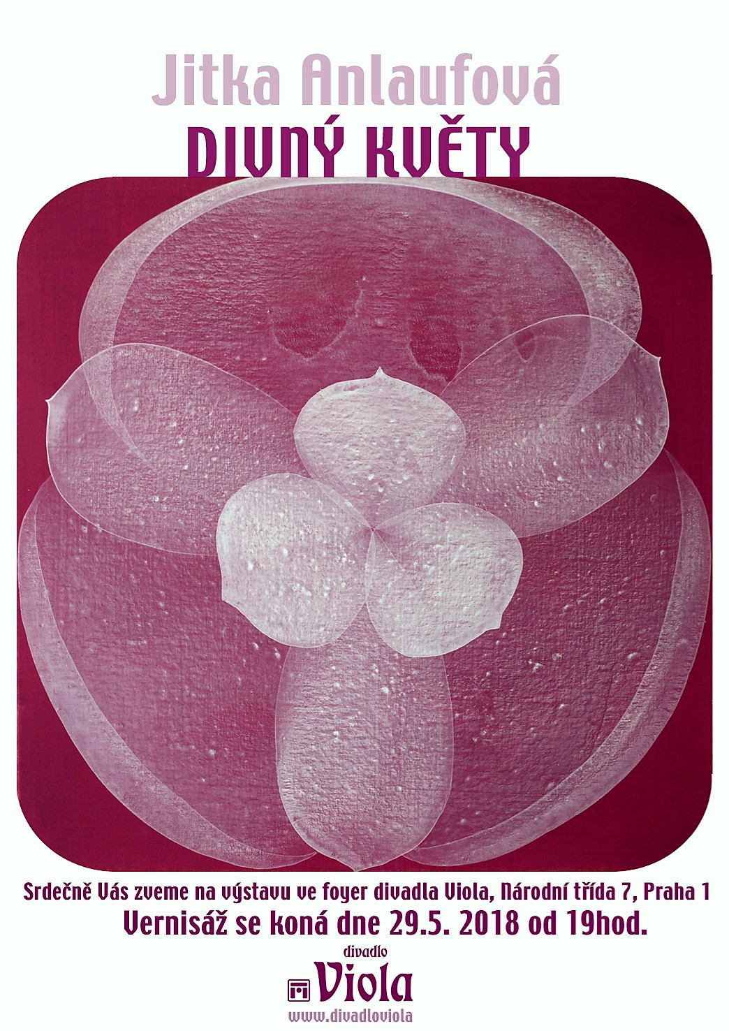 Oblíbené Divadlo Viola na Národní třídě v centru Prahy je místem zaslíbeným nejen kvalitnímu divadlu, ale také výtvarnému umění. Útulný foyer pravidelně zdobí díla renomovaných umělců, od 30. května jej zaplní výstava obrazů známé abstraktní malířky Jitky Anlaufové nazvaná Divný květy.