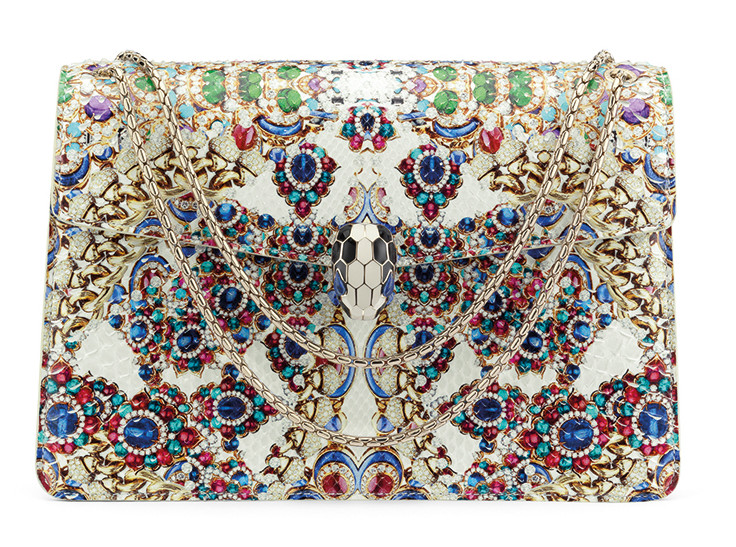 Vzor kabelky je inspirovaný okázalými florálními motivy High Jewelry náhrdelníku z roku 1968, který se stal její předlohou. Náhrdelník obsypaný smaragdy, rubíny a safíry ve výbrusu kabošon doplněný o diamanty rozzářil během slavnostního předávání cen Akademie – Oscar v roce 2006 večerní róbu herečky Keiry Knightleyové, nominované na Oscara za snímek Pýcha a předsudek.Díky barevnosti a výbrusu barevných kamenů působí náhrdelník uhlazeně a elegantně, oproti asymetrickým florálním motivům hojně používaným v tehdejší době ve Francii, od kterých se chtěla značka Bulgari odlišit. Moderní interpretace náhrdelníku je vyobrazena na kabelce Serpenti provedené v kůži z krajty, vytvářející kontrast hrubých šupin a uhlazeného šperkového motivu. Naprostou samozřejmostí je ikonické zavírání v podobě hadí hlavičky s modrýma očima osazenýma lapis lazuli. Kabelka je výsledkem náročného, především ručního výrobního procesu trvajícího tři měsíce. Na jeho konci ovšem čeká jedna z 68 kabelek limitované edice.