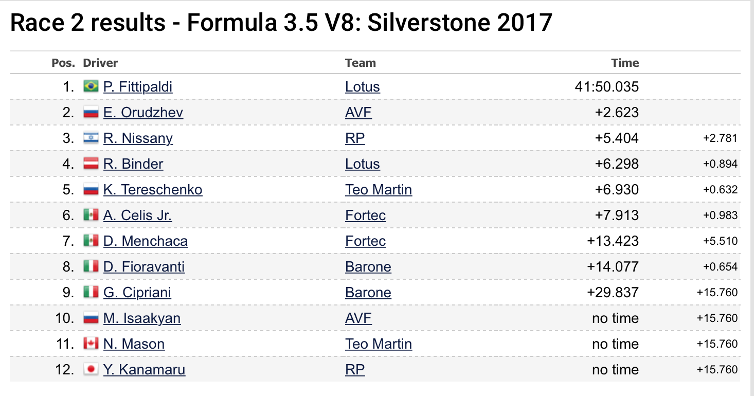 Vnuk dvojnásobného mistra světa formule 1 Emersona Fittipladiho se ukazuje jako velká posila. Lotus si jeho služby pojistil před touto sezónou a po prvním víkendu je Pietro v čele celého seriálu. V Anglii mu zdatně sekundoval i stájový kolega René Binder, který bral v sobotu páté místo a v neděli to ještě o příčku vylepšil. „Škoda, že to nevyšlo na pódium. Moc jsem chtěl, udělal jsem pro to maximum. Ale budou další závody, tentokrát to prostě nevyšlo. Je to pořád jen sport,“ nedělal si rakouský pilot těžkou hlavu. Na loni ještě parťáka Roye Nissanyho mu chybělo něco přes vteřinu. I třetí místo Argentince je však důkazem, že Lotus angažuje opravdu kvalitní jezdce.