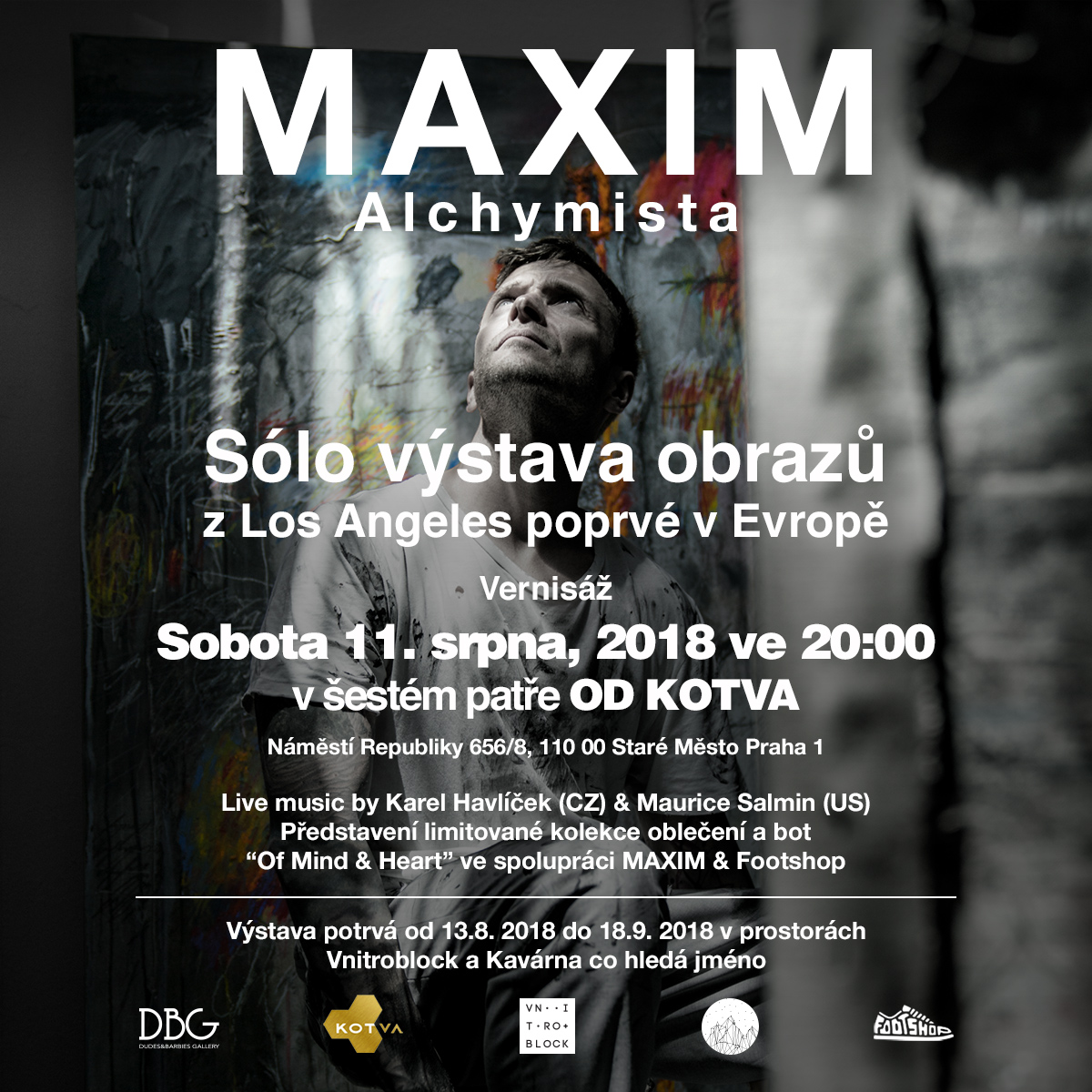 Součástí večera bude živý DJ set v režii úspěšného hudebního skladatele a Maximova bratra Karla Havlíčka a posily z Los Angeles na bicí Maurice Salmina. Návštěvníci si také budou moci z vernisáže odnést módní kousek z limitované edice nositelného umění (oblečení a bot) „Of Mind and Heart” vzniklé ve spolupráci MAXIMA s obchodem footshop.cz. Kolekce pak bude k dostání ve Vnitroblocku až do vyprodání zásob. Vernisáž je otevřena veřejnosti a vstup je zdarma. Po vernisáži se výstava přesune do Kavárny co hledá jménoa Vnitroblocku, kde bude k vidění až do 18. září.
