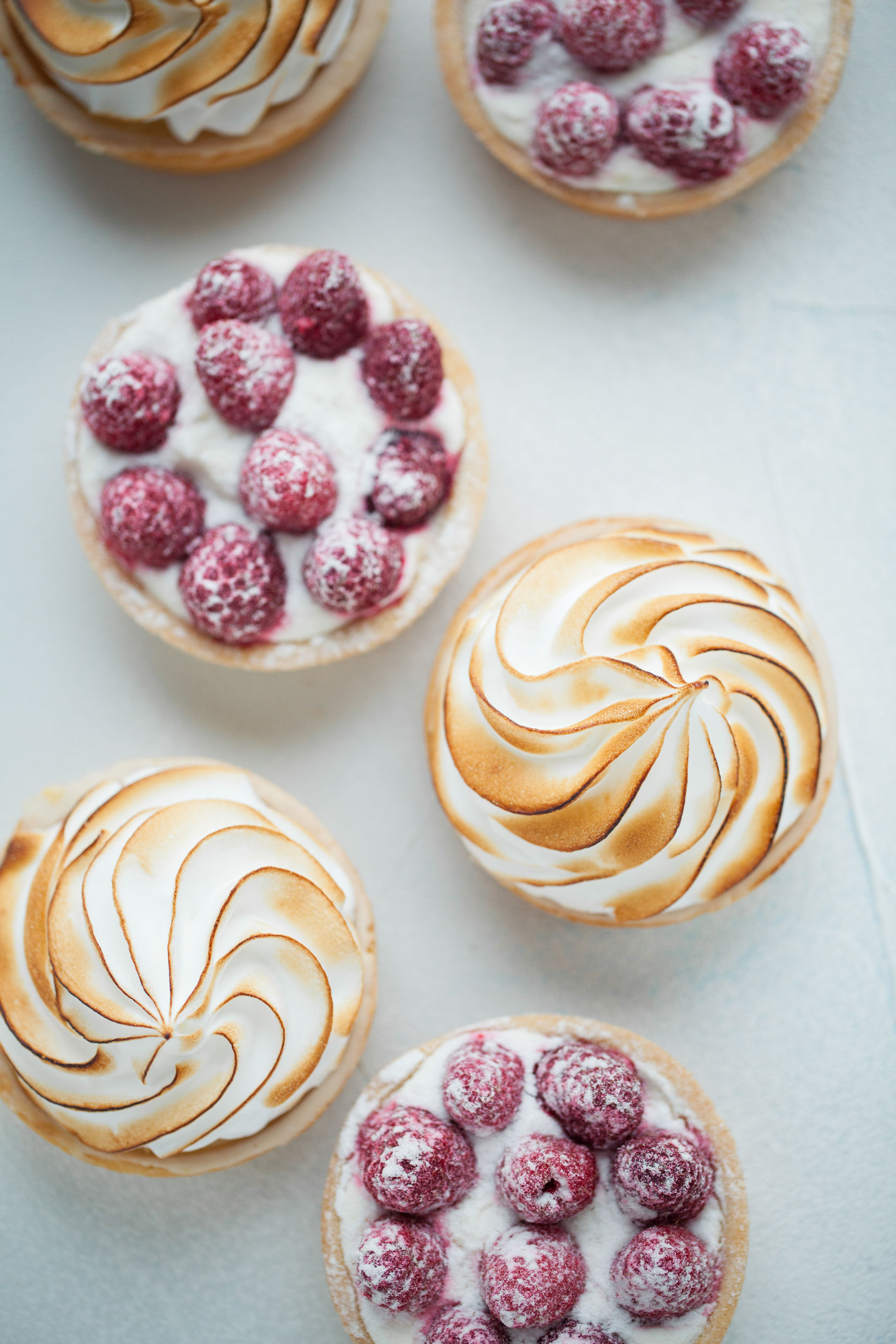 - 94125346 – delicious lemon and raspberry tartlets with meringue on a white vintage plate. sweet treat on a light blue background. flat lay and copy space. top view.