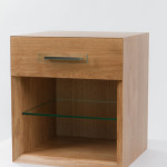 Dubový noční stolek přírodní barvy se skosenými vnitřními hranami. Je s jednou zásuvkou a skleněnou policí.