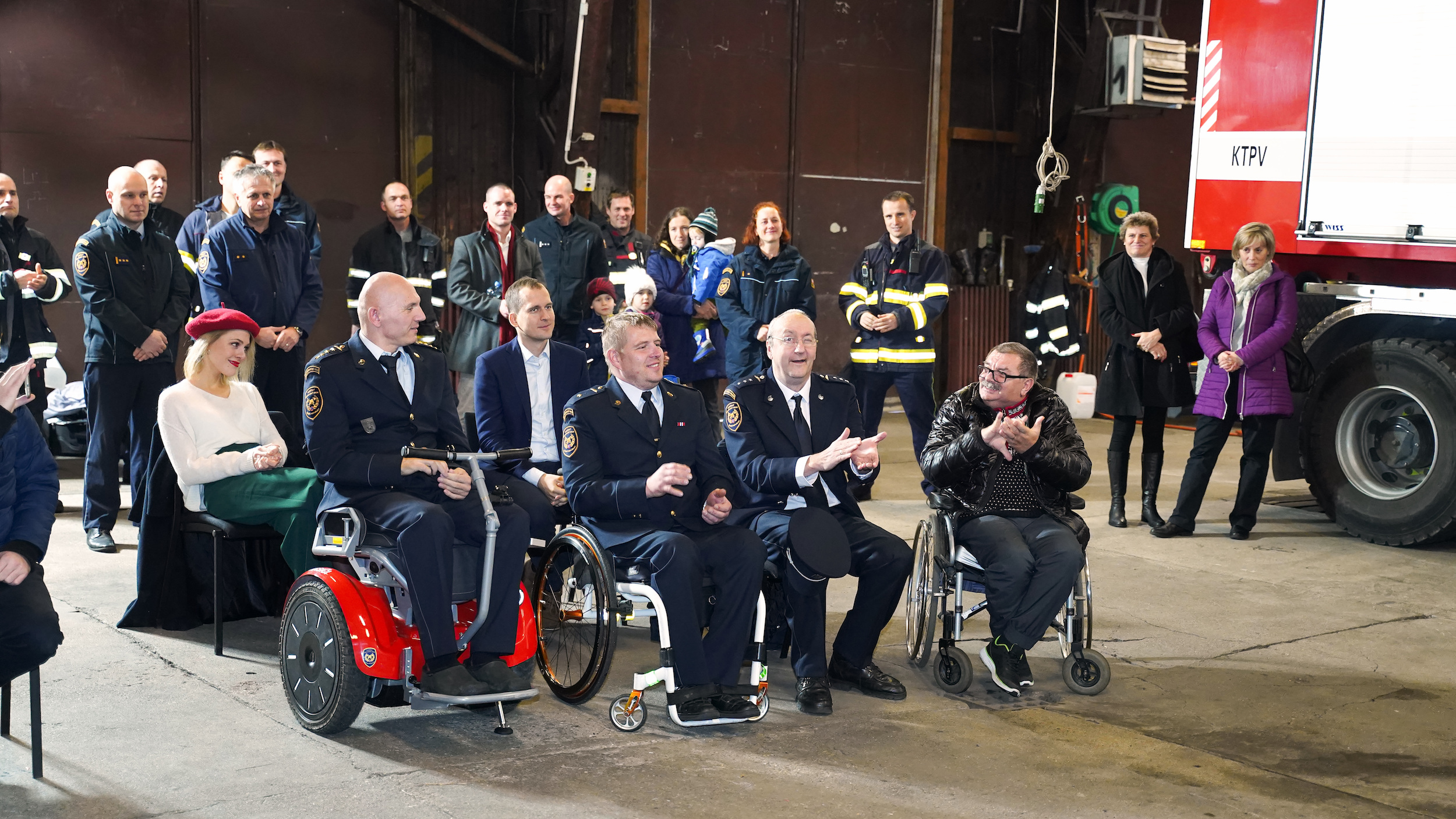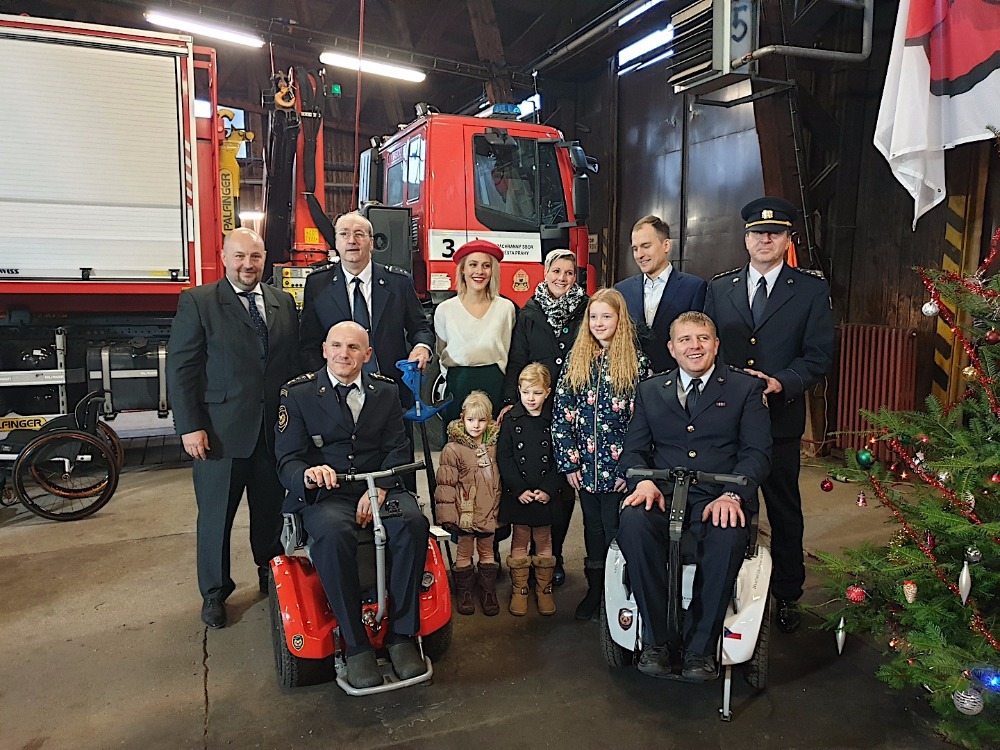 Předseda správní rady Nadačního fondu, pan Hynek Čech, starosta pro Prahu 7 Mgr. Jan Čižinský, náměstek ředitele HZS pro Prahu, plk. Miloš Hladík a muzikálová Popelka, Kateřina Klausová, předali zraněnému hasičovi Martinovi Šabatovi revoluční invalidní vozík GENNY URBAN od SEGWAY v hodnotě téměř 590.000,-Kč, který mu umožní lépe překonávat bariéry nejen v životě, ale i na cestách..