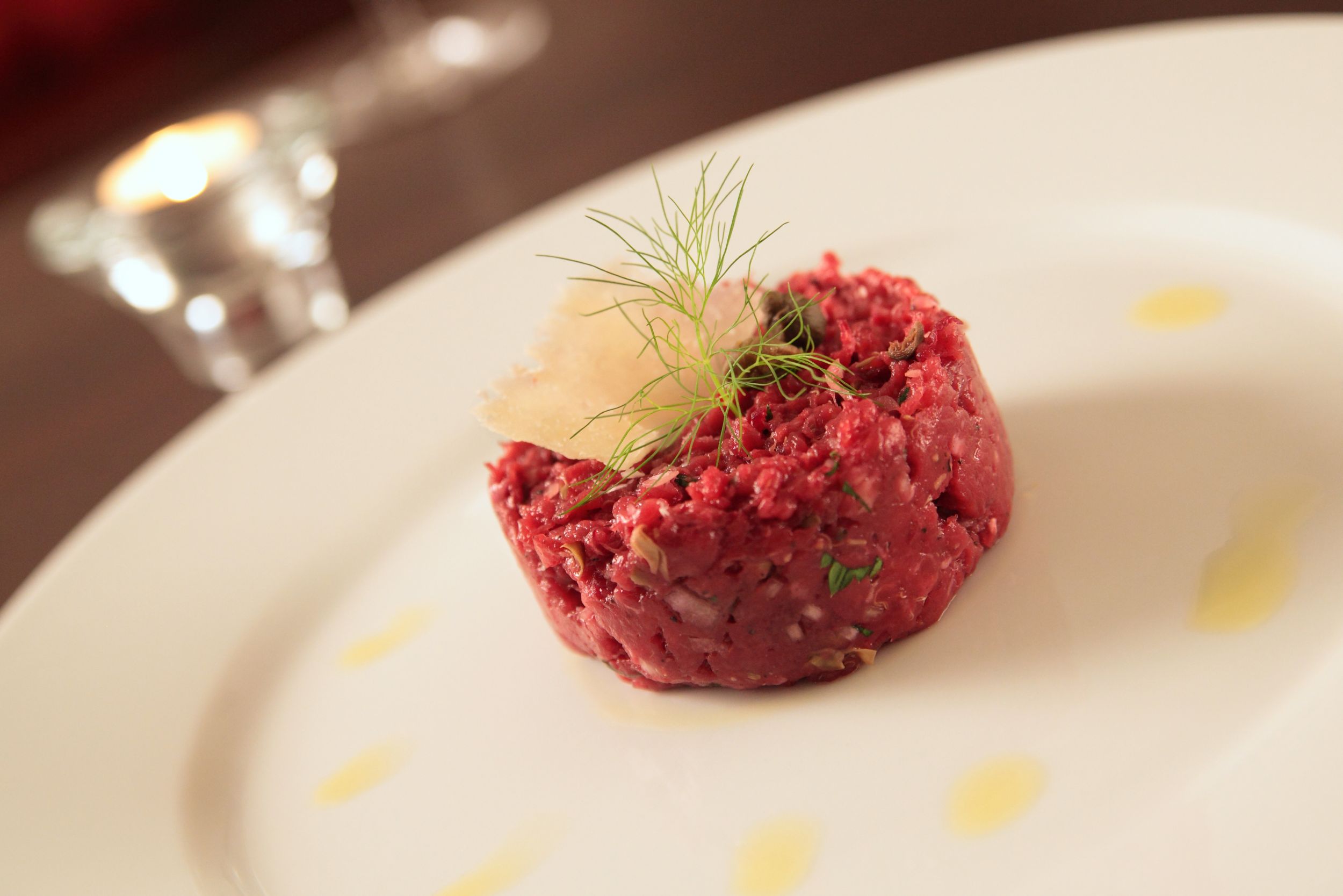 Hovězí tataráček s červenou řepou, šalotkou a kapary