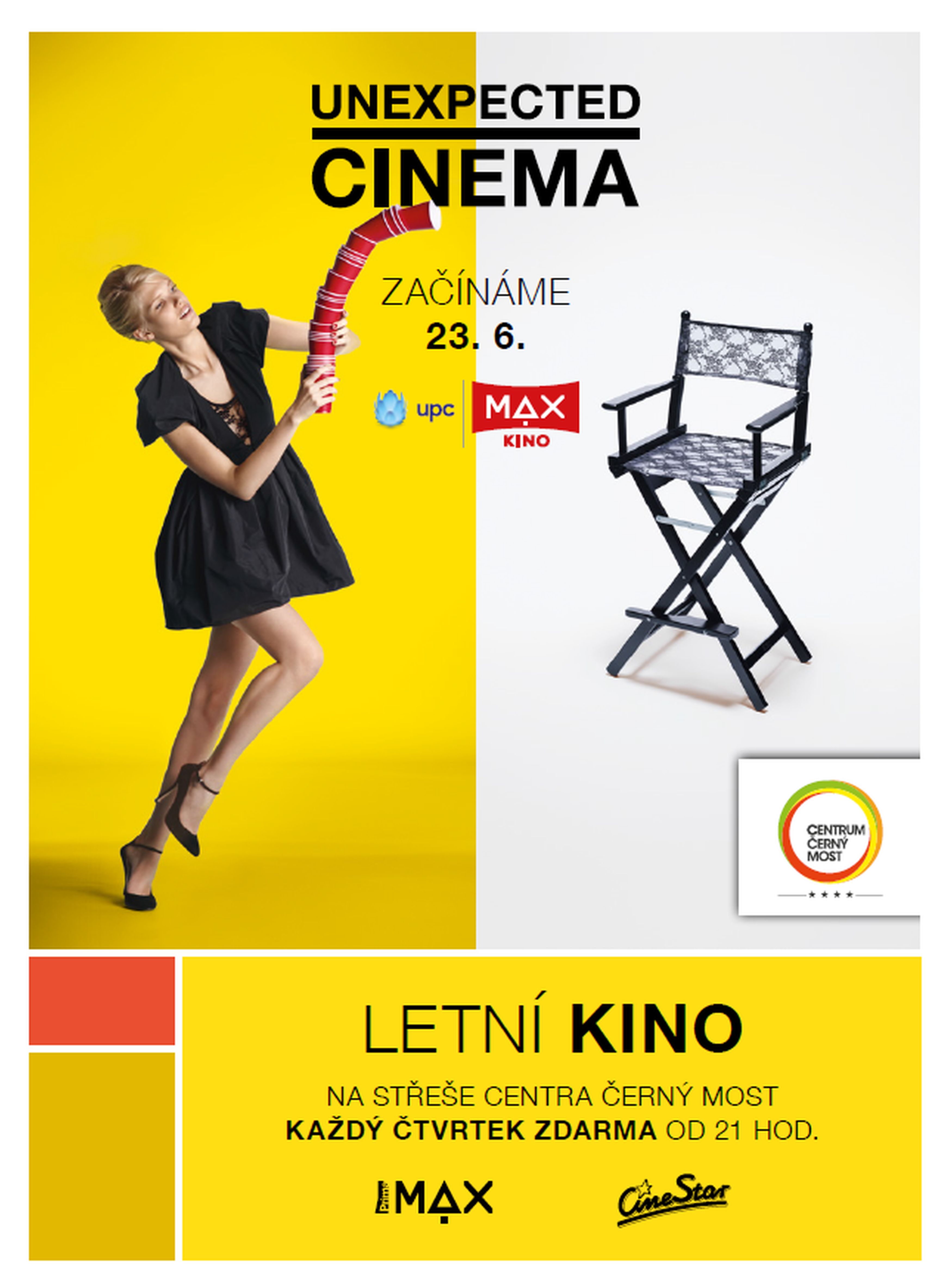 Návštěvníci Centra Černý Most budou mít během 10 čtvrtků od 23. června do 25. srpna jedinečnou příležitost zažít nevšední kulturní zážitek na jeho střeše, jež se promění v zázemí unikátního letního kina. Během bezplatných promítání se jim v tomto období představí nejzajímavější české filmy natočené v roce 2015. Jejich výběru se ujala odborná porota složená z odborníků na českou kinematografii, respektovaných tuzemských filmových kritiků (Miroslava Spáčilová a Jan Foll) nebo známých filmových publicistů (například František Fuka a Tereza Spáčilová). Projekce startují vždy od 21. hodiny. Po celou dobu trvání programu letního UPC MAX kina mohou jeho diváci hlasovat, který z desítky předvedených snímků získá MAX Cenu 2015. Vítězná trofej pochází z dílny uznávaného mladého návrháře Vladimíra Staňka, jenž stojí v čele vlastní značky pánského oblečení a doplňků STINAK a působí rovněž jako designér pánské linie značky Pietro Filipi. Vystavena bude na Central Plaze v Centru Černý Most.