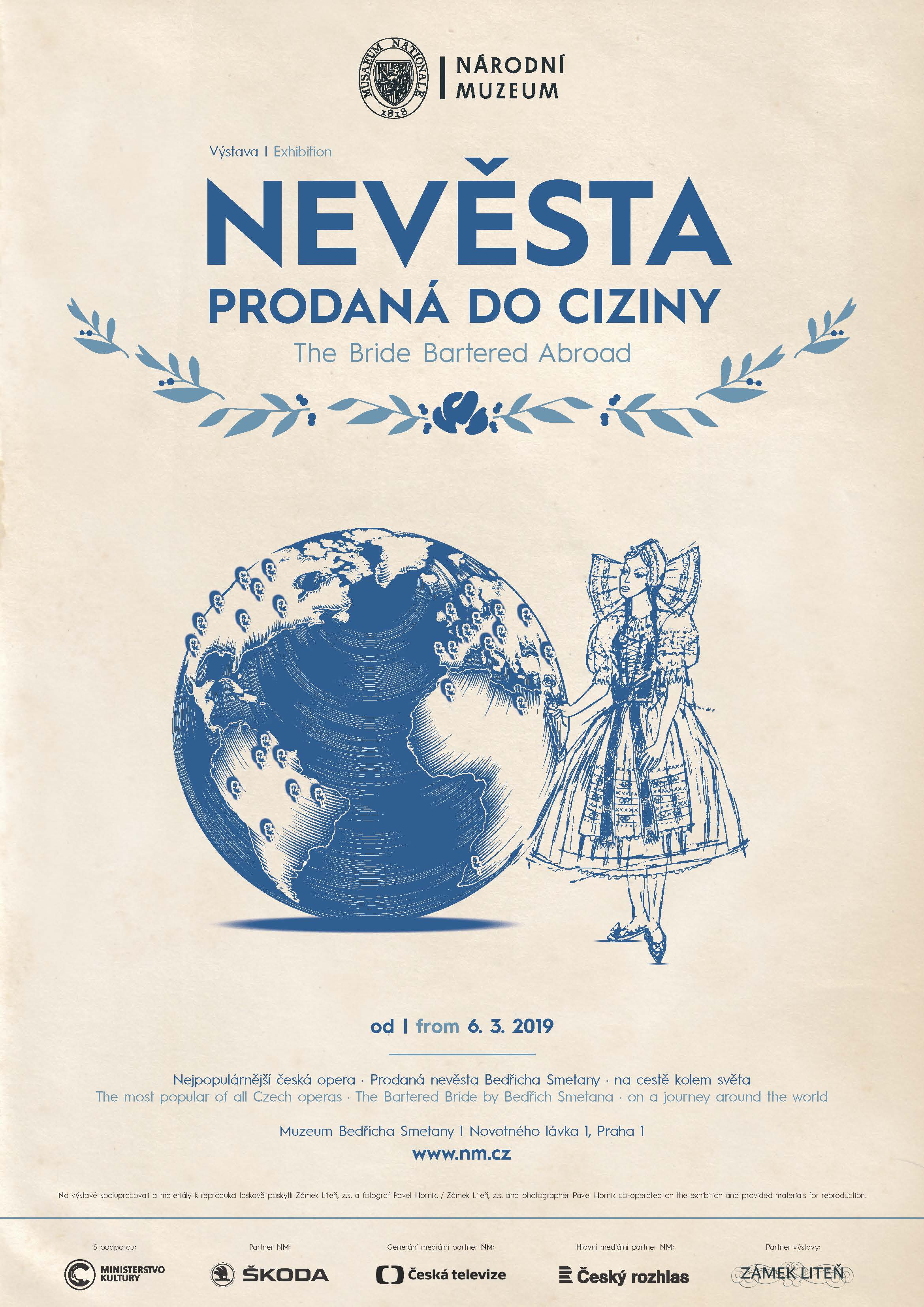 Výstava Nevěsta prodaná do ciziny prezentuje nejpopulárnější českou operu – Prodanou nevěstu Bedřicha Smetany – od prvního provedení v cizině v Petrohradě v roce 1871 ještě za autorova života, přes její triumf ve Vídni roku 1892 nebo uvedení v New Yorku s Emou Destinnovou v roce 1909. Během devadesátých let 19. století byla Smetanova opera uvedena v mnoha evropských městech, zejména v německy mluvícím prostoru, a nepřestala se rozšiřovat ani na počátku 20. století, kdy se prosadila také v Americe, Africe, Asii i Austrálii. „V zámoří ji v roce 1909 uvedla Metropolitní opera – tehdy se hrála v německém překladu. Jako Mařenka zde zazářila pražská rodačka, sopranistka Ema Destinnová, která se o uvedení opery na této prestižní scéně zasloužila společně s dirigentem Gustavem Mahlerem,“ upřesňuje autorka výstavy Kateřina Viktorová. „A v roce 1941 ji pro MET, tentokrát již v anglickém překladu, nastudovala další slavná česká pěvkyně, Jarmila Novotná,“ doplňuje Ivana Leidlová, ředitelka neziskové organizace Zámek Liteň, z.s.