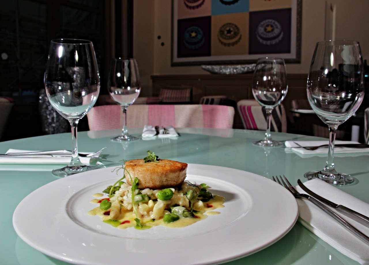 - Mořský ďas pečený ve vepřové síťce, fenyklové rissoto s estragonem, račí bisque a tomatové concassé