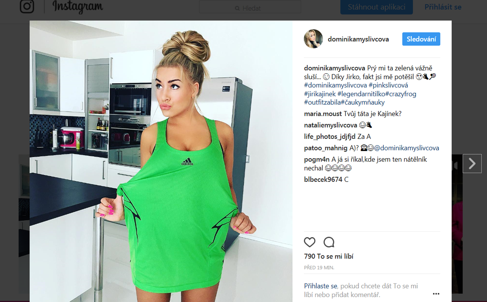 Ano, uznáváme, že růžová blondýna má také srdce na pravém místě, protože už nejednou pomohla lidem, kteří to opravdu potřebovali. Stačí vzpomenout na postižené holčičky Karolínku a Terezku. To však neznamená, že Dominice sem tam „nehrábne“ dokonce i v rámci charity. Na svůj profil na sociálních sítích si totiž dala fotku v zeleném tričku. Na tom by samozřejmě nebylo nic zvláštního (když přehlédneme fakt, že chodí vlastně jen v růžové), kdyby ovšem její outfit nevzbuzoval dojem, že z něj právě vysvlékla Jiřího Kajínka! Ano, TOHO Kajínka, které nedávno omilostnil prezident Zeman. Nebo že by ho přeci jen ukecala na nějakou charitu? Necháme se překvapit.