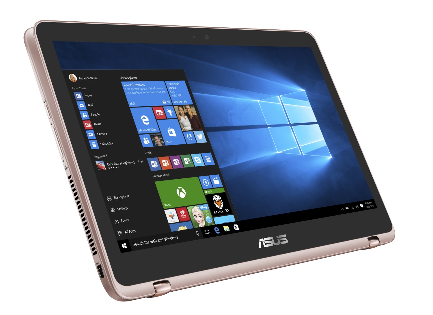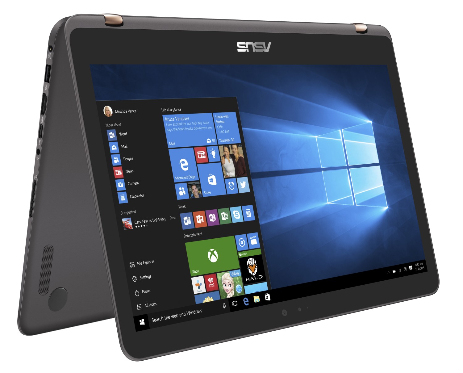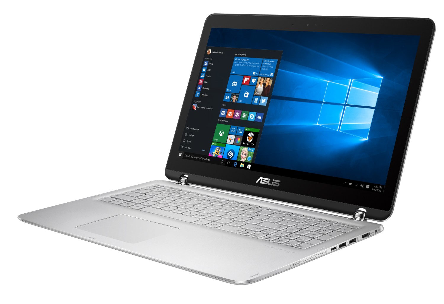 Kvalitní zvuk zajišťují výkonné stereo reproduktory, vylepšené audio systémem ASUS SonicMaster, který je navržený ve spolupráci se zvukovými mistry ze společnosti Bang and Olufsen. Přesný mikrofon je vybaven funkcí na potlačení okolního hluku, čímž umožňuje jasnější zvukové nahrávky a zprostředkovává srozumitelnější hlasovou interakci s Windows Cortana, pro kterou je certifikován.