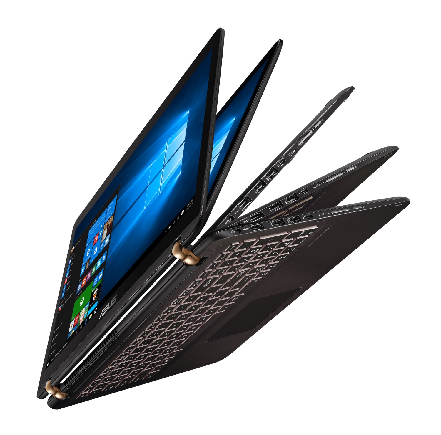 Kromě čtečky SD karet a kombinovaného audio jacku je ZenBook Flip UX360 vybaven také dvěma porty USB 3.0, jedním portem USB 3.1 typu C a plnohodnotným HDMI portem. ZenBook Flip UX560 k tomu přidává o jeden port USB 3.0 více a vybrané konfigurace také USB 3.1 typu C s podporou Thunderbolt rozhraní.