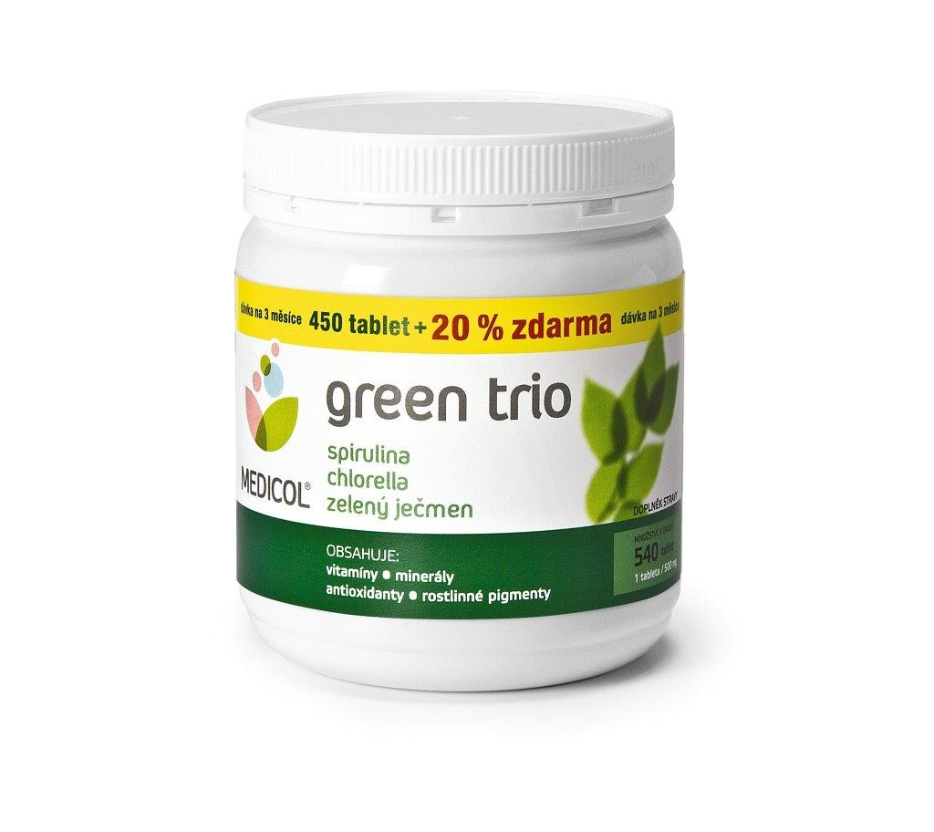 V přírodě jsou zelené potraviny nejkoncentrovanějším zdrojem živin a poskytují nám mikroživiny, které často chybí ve zpracované stravě. Tato strava je bohužel již natolik běžnou součástí našeho jídelníčku, že se jí člověk normálně není schopen vyhnout. Mražené polotovary, jídlo z fast-foodů a další podobné způsoby stravování sice zasytí náš žaludek, ale nepřinášejí nám nutričně plnohodnotnou dávku tělu prospěšných živin. Mladý ječmen, chlorela a spirulina tvoří trojici, jejíž specifické účinky na lidský organismus se ideálně doplňují, proto je vhodné používat všechny najednou. Jejich užívání tělu pomáhá s detoxikací, harmonizují a posilují celý organismus. K tomuto účelu byla vyvinuta speciální směs tzv. „zelený multivitamin“. Jedná se o přírodní preparát GREEN TRIO Medicol, který právě díky optimální kombinaci čistě přírodních složek, přináší v jedné tabletě účinek hned tří zelených potravin.Tablety jsou navíc lisovány za studena, aby v nich zůstalo zachováno maximum vitamínů. Na rozdíl od synteticky vyráběných multivitaminů, obsahuje GREEN TRIO Medicol směsi látek, které nemohou být vytvořeny uměle v laboratořích. Díky tomu je jediným přípravkem svého druhu na českém trhu.
