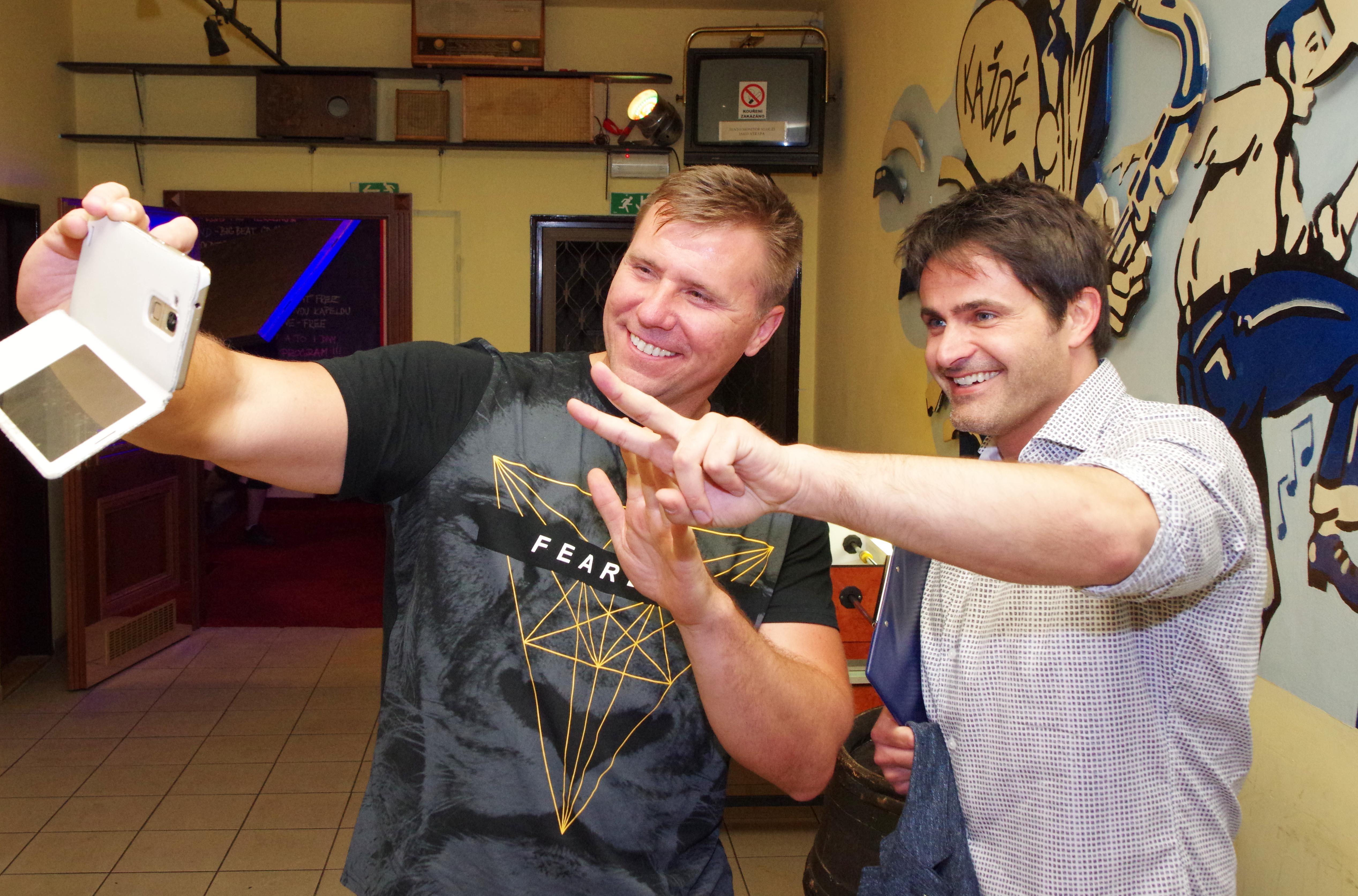 Co je tak rozpálilo? Oba pánové se těšili z přehlídky v plavkách módní značky Fashion Island a dlouhonohé krásky v atraktivních modelech je nenechávaly příliš v klidu. Zřejmě probírali svůj vkus a jejich rozhovor se po chvíli jevil natolik živým a vyhroceným, až Šimůnek uklidňoval urostlého fotografa gestem smíru. Nakonec vše dopadlo přátelským podáním ruky, úsměvem na tváři a společným selfíčkem. Káš se vyfotil se svojí favoritkou Kateřinou Kasanovou a vrátil se ke svému stolu.