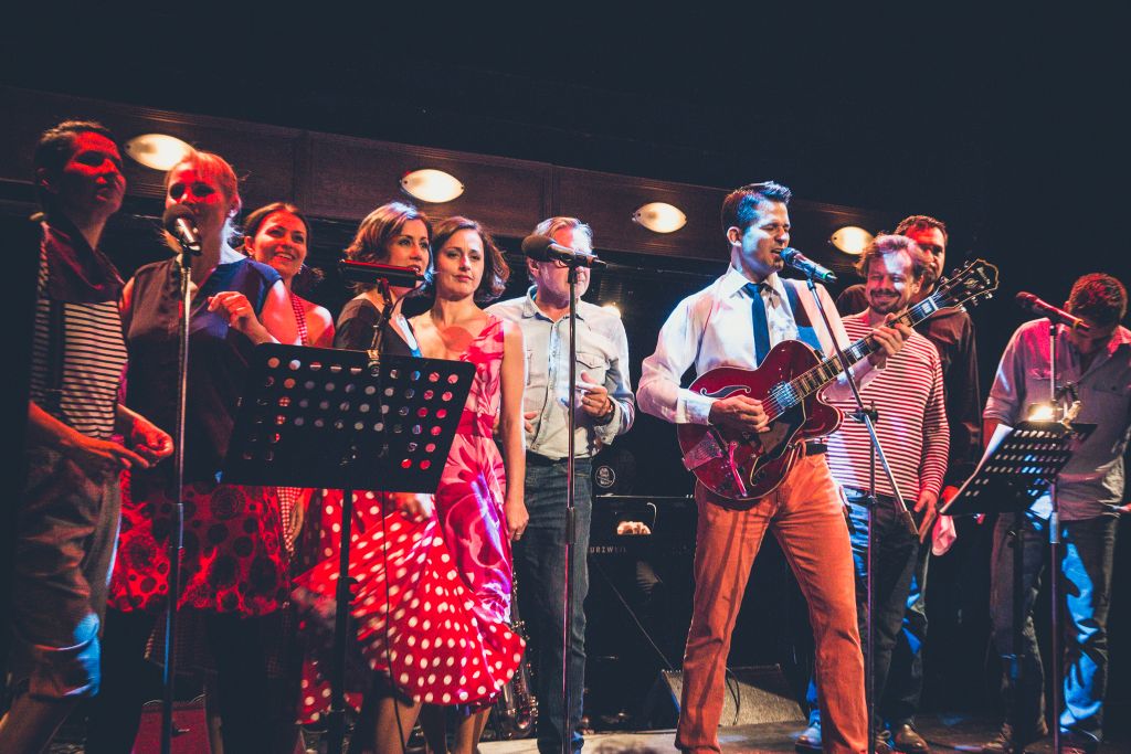 z inscenace Proč muži neposlouchají a ženy neumí číst v mapách prokládaný autorskými písněmi herců Městských divadel pražských. /jeviště Divadla ABC/