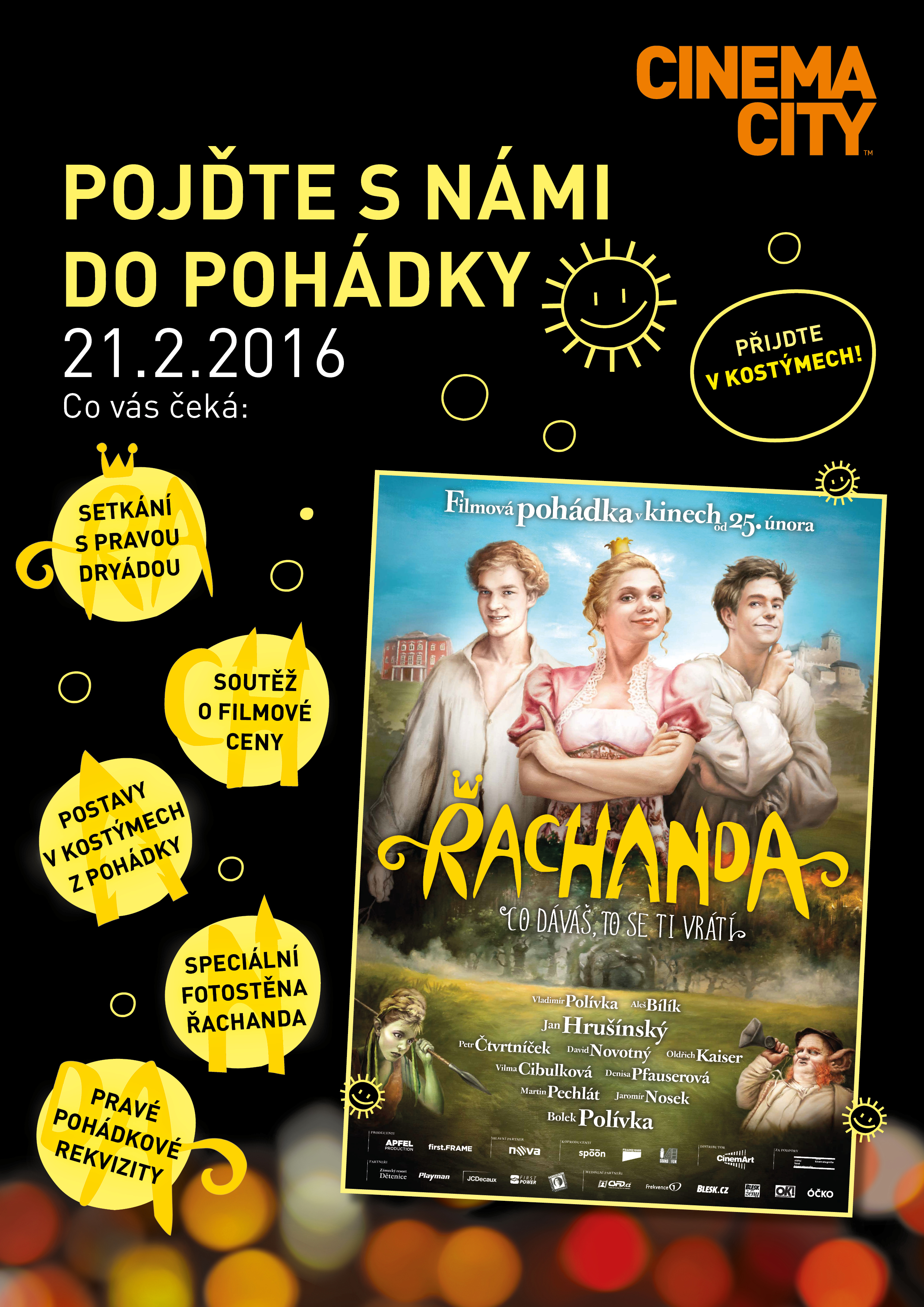 Na konci února přichází do kin hvězdně obsazená pohádka Řachanda. Multiplexy Cinema City si v rámci předpremiéry této pohádky nachystaly pro všechny malé i velké návštěvníky kina speciální akci nazvanou „Pojďte s námi do pohádky“. Pokud v neděli 21. února přijdete, uvidíte nejen předpremiéru této pohádky, ale čeká na vás a vaše ratolesti opravdu autentická pohádková neděle. Těšit se můžete na kostýmy a rekvizity z této pohádky, soutěže